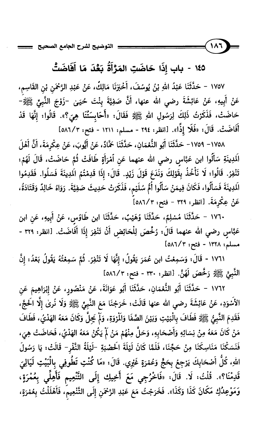 1758 - 1759 - حَدَّثَنَا أَبُو النُّعْمَانِ، حَدَّثَنَا حَمَّادٌ، عَنْ أَيُّوبَ، عَنْ عِكْرِمَةَ، أَنَّ أَهْلَ المَدِينَةِ سَأَلُوا ابْنَ عَبَّاسٍ رضي الله عنهما عَنِ امْرَأَةٍ طَافَتْ ثُمَّ حَاضَتْ، قَالَ لَهُمْ: تَنْفِرُ. قَالُوا: لاَ نَأْخُذُ بِقَوْلِكَ وَنَدَعَ قَوْلَ زَيْدٍ. قَالَ: إِذَا قَدِمْتُمُ المَدِينَةَ فَسَلُوا. فَقَدِمُوا المَدِينَةَ فَسَأَلُوا، فَكَانَ فِيمَنْ سَأَلُوا أُمُّ سُلَيْمٍ، فَذَكَرَتْ حَدِيثَ صَفِيَّةَ. رَوَاهُ خَالِدٌ وَقَتَادَةُ، عَنْ عِكْرِمَةَ. [انظر: 329 - فتح: 3/ 586]