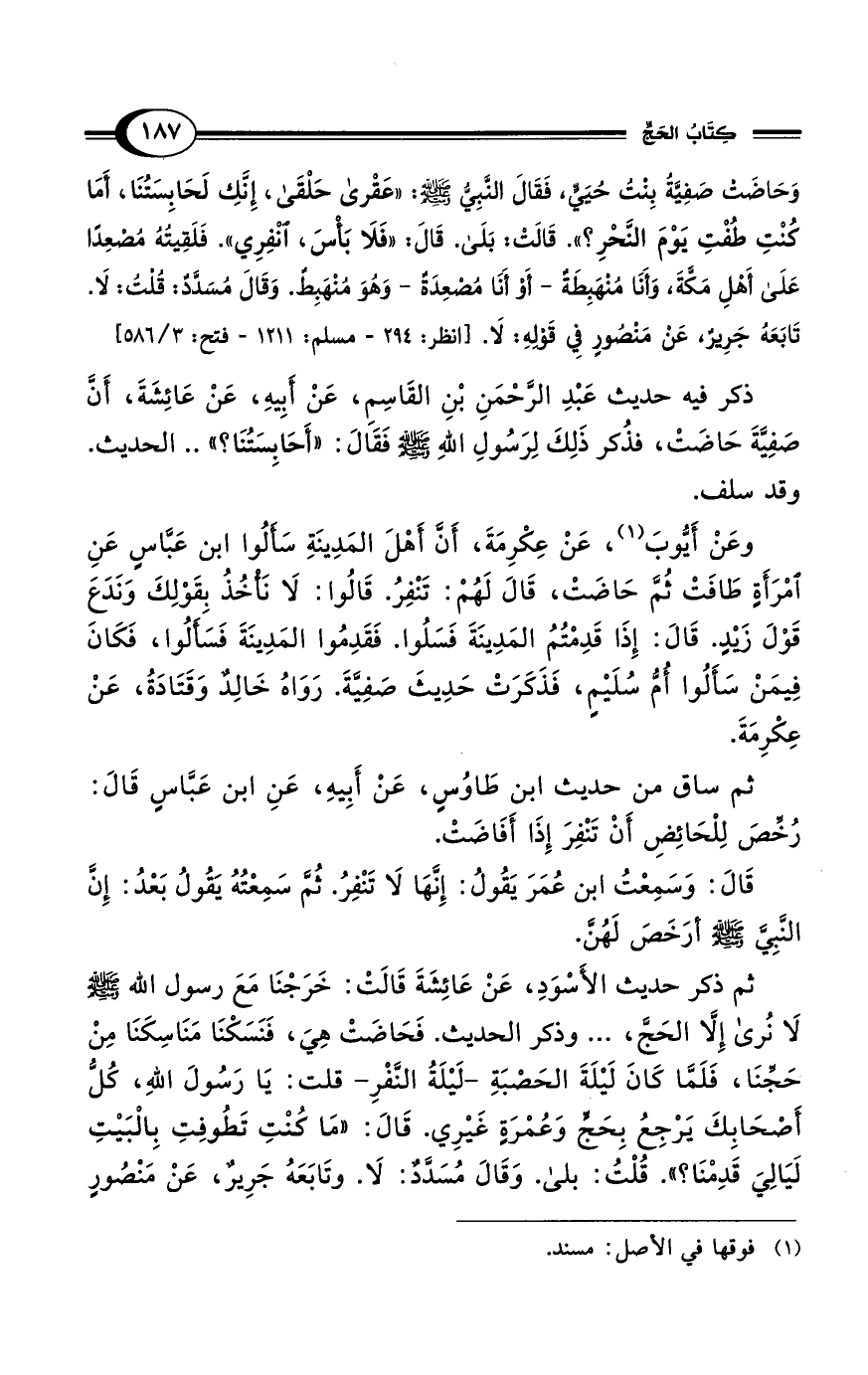 ثم ذكر حديث الأَسْوَدِ، عَنْ عَائِشَةَ قَالَتْ: خَرَجْنَا مَعَ رسول الله - صلى الله عليه وسلم - لَا نُرى إِلَّا الحَجَّ، ... وذكر الحديث. فَحَاضَتْ هِيَ، فَنَسَكْنَا مَنَاسِكَنَا مِنْ حَجِّنَا، فَلَمَّا كَانَ لَيْلَةَ الحَصْبَةِ -لَيْلَةُ النَّفْرِ- قلت: يَا رَسُولَ اللهِ، كُلُّ أَصْحَابِكَ يَرْجِعُ بِحَجٍّ وَعُمْرَةٍ غَيْرِي. قَالَ: "مَا كُنْتِ تَطُوفِتِ بِالبَيْتِ لَيَالِيَ قَدِمْنَا؟ ". قُلْتُ: بلى. وَقَالَ مُسَدَّدٌ: لَا. وتَابَعَهُ جَرِيرٌ، عَنْ مَنْصُورٍ