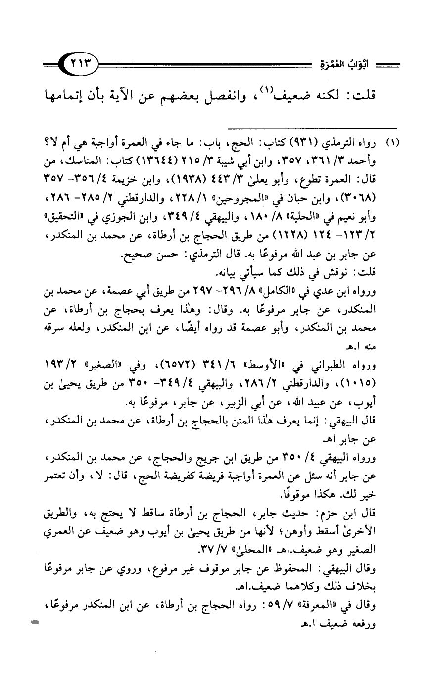 (¬1) رواه الترمذي (931) كتاب: الحج، باب: ما جاء في العمرة أواجبة هي أم لا؟ وأحمد 3/ 361، 357، وابن أبي شيبة 3/ 215 (13644) كتاب: المناسك، من قال: العمرة تطوع، وأبو يعلى 3/ 443 (1938)، وابن خزيمة 4/ 356 - 357 (3068)، وابن حبان في "المجروحين" 1/ 228، والدارقطني 2/ 285 - 286، وأبو نعيم في "الحلية" 8/ 180، والبيهقي 4/ 349، وابن الجوزي في "التحقيق" 2/ 123 - 124 (1228) من طريق الحجاج بن أرطاة، عن محمد بن المنكدر، عن جابر بن عبد الله مرفوعًا به. قال الترمذي: حسن صحيح.