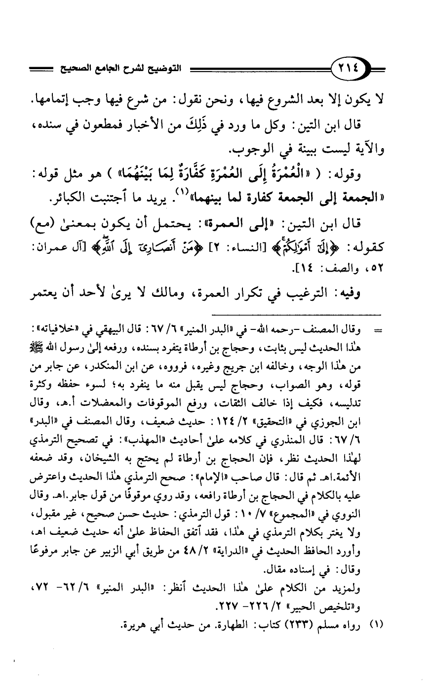 قال ابن التين: "إلى العمرة": يحتمل أن يكون بمعنى (مع) كقوله: {إِلَى أَمْوَالِكُمْ} [النساء: 2] {مَنْ أَنصَارِىَ إلَى اَللهِ} [آل عمران: 52، والصف: 14].