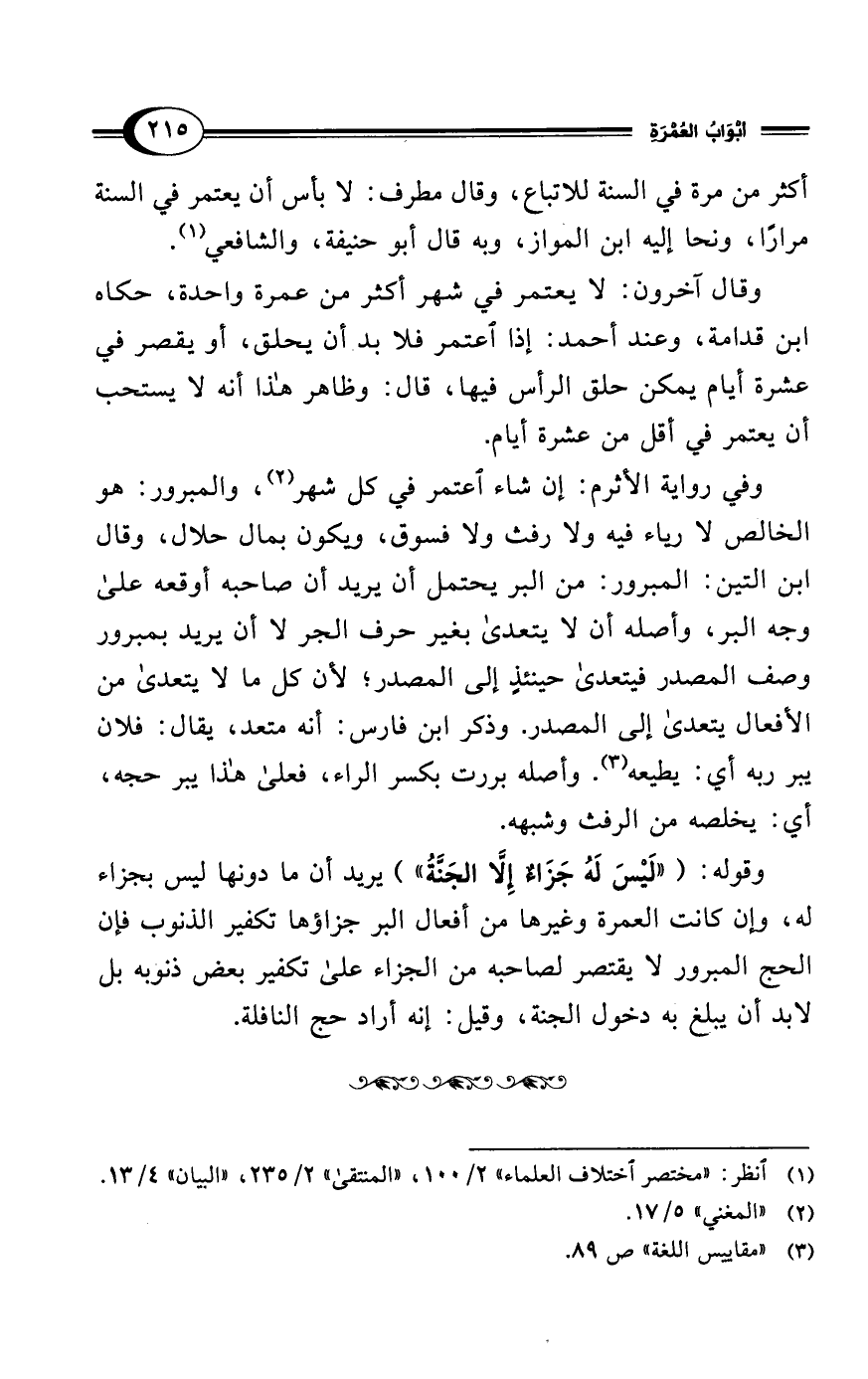 وقال آخرون: لا يعتمر في شهر أكثر من عمرة واحدة، حكاه ابن قدامة، وعند أحمد: إذا اعتمر فلا بد أن يحلق، أو يقصر في عشرة أيام يمكن حلق الرأس فيها، قال: وظاهر هذا أنه لا يستحب أن يعتمر في أقل من عشرة أيام.