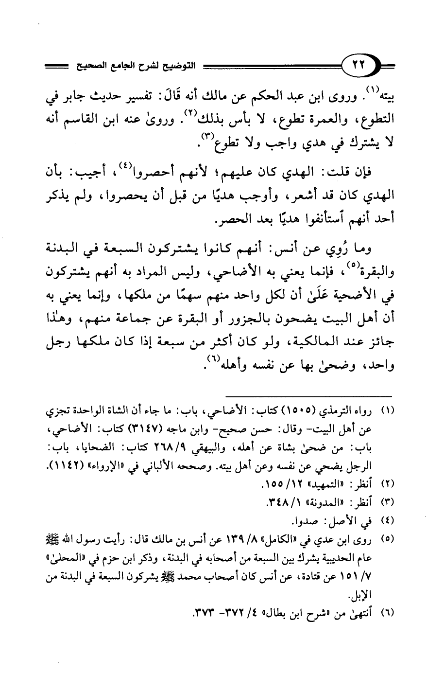 وما رُوِي عن أنس: أنهم كانوا يشتركون السبعة في البدنة والبقرة (¬5)، فإنما يعني به الأضاحي، وليس المراد به أنهم يشتركون في الأضحية عَلَى أن لكل واحد منهم سهمًا من ملكها، وإنما يعني به أن أهل البيت يضحون بالجزور أو البقرة عن جماعة منهم، وهذا جائز عند المالكية، ولو كان أكثر من سبعة إذا كان ملكها رجل واحد، وضحى بها عن نفسه وأهله (¬6).