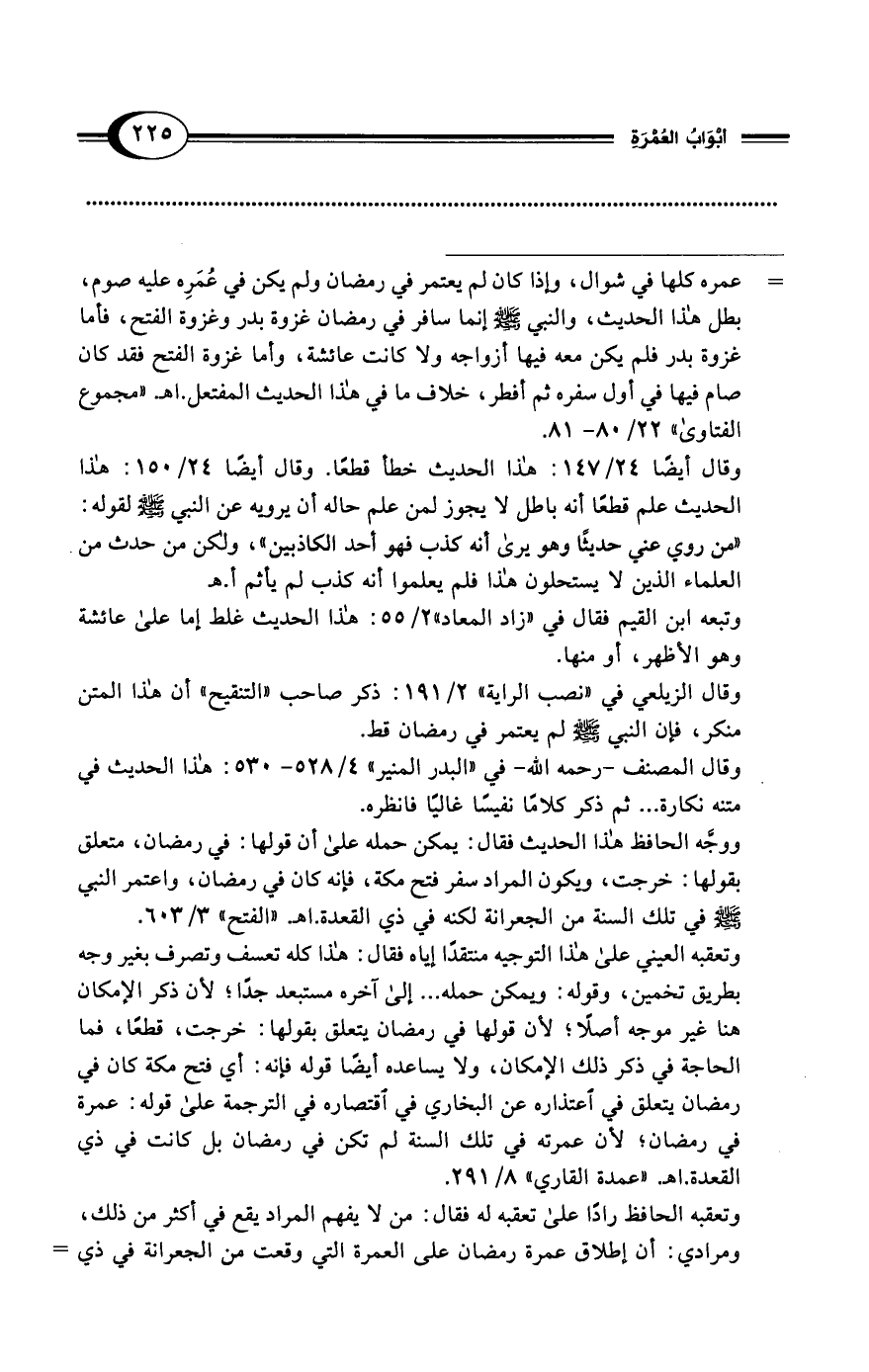 وقال الزيلعي في "نصب الراية" 2/ 191: ذكر صاحب "التنقيح" أن هذا المتن منكر، فإن النبي - صلى الله عليه وسلم - لم يعتمر في رمضان قط.