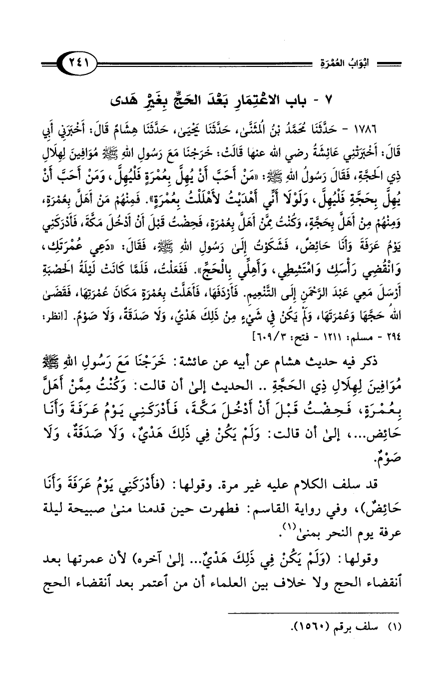 1786 - حَدَّثَنَا مُحَمَّدُ بْنُ المُثَنَّى، حَدَّثَنَا يَحْيَى، حَدَّثَنَا هِشَامٌ قَالَ: أَخْبَرَنِي أَبِي قَالَ: أَخْبَرَتْنِي عَائِشَةُ رضي الله عنها قَالَتْ: خَرَجْنَا مَعَ رَسُولِ اللهِ - صلى الله عليه وسلم - مُوَافِينَ لِهِلاَلِ ذِي الحَجَّةِ، فَقَالَ رَسُولُ اللهِ - صلى الله عليه وسلم -: "مَنْ أَحَبَّ أَنْ يُهِلَّ بِعُمْرَةٍ فَلْيُهِلَّ، وَمَنْ أَحَبَّ أَنْ يُهِلَّ بِحَجَّةِ فَلْيُهِلَّ، وَلَوْلاَ أَنِّي أَهْدَيْتُ لأَهْلَلْتُ بِعُمْرَةٍ". فَمِنْهُمْ مَنْ أَهَلَّ بِعُمْرَةٍ، وَمِنْهُمْ مِنْ أَهَلَّ بِحَجَّةٍ، وَكُنْتُ مِمَّنْ أَهَلَّ بِعُمْرَةٍ، فَحِضْتُ قَبْلَ أَنْ أَدْخُلَ مَكَّةَ، فَأَدْرَكَنِي يَوْمُ عَرَفَةَ، وَأَنَا حَائِضٌ، فَشَكَوْتُ إِلَى رَسُولِ اللهِ - صلى الله عليه وسلم -، فَقَالَ: "دَعِي عُمْرَتَكِ، وَانْقُضِي رَأْسَكِ وَامْتَشِطِي، وَأَهِلِّي بِالحَجِّ". فَفَعَلْتُ، فَلَمَّا كَانَتْ لَيْلَةُ الحَصْبَةِ أَرْسَلَ مَعِي عَبْدَ الرَّحْمَنِ إِلَى التَّنْعِيمِ. فَأَرْدَفَهَا، فَأَهَلَّتْ بِعُمْرَةٍ مَكَانَ عُمْرَتِهَا، فَقَضَى اللهُ حَجَّهَا وَعُمْرَتَهَا، وَلَمْ يَكُنْ فِي شَيْءٍ مِنْ ذَلِكَ هَدْيٌ، وَلاَ صَدَقَةٌ، وَلاَ صَوْمٌ. [انظر: 294 - مسلم: 1211 - فتح: 3/ 609]