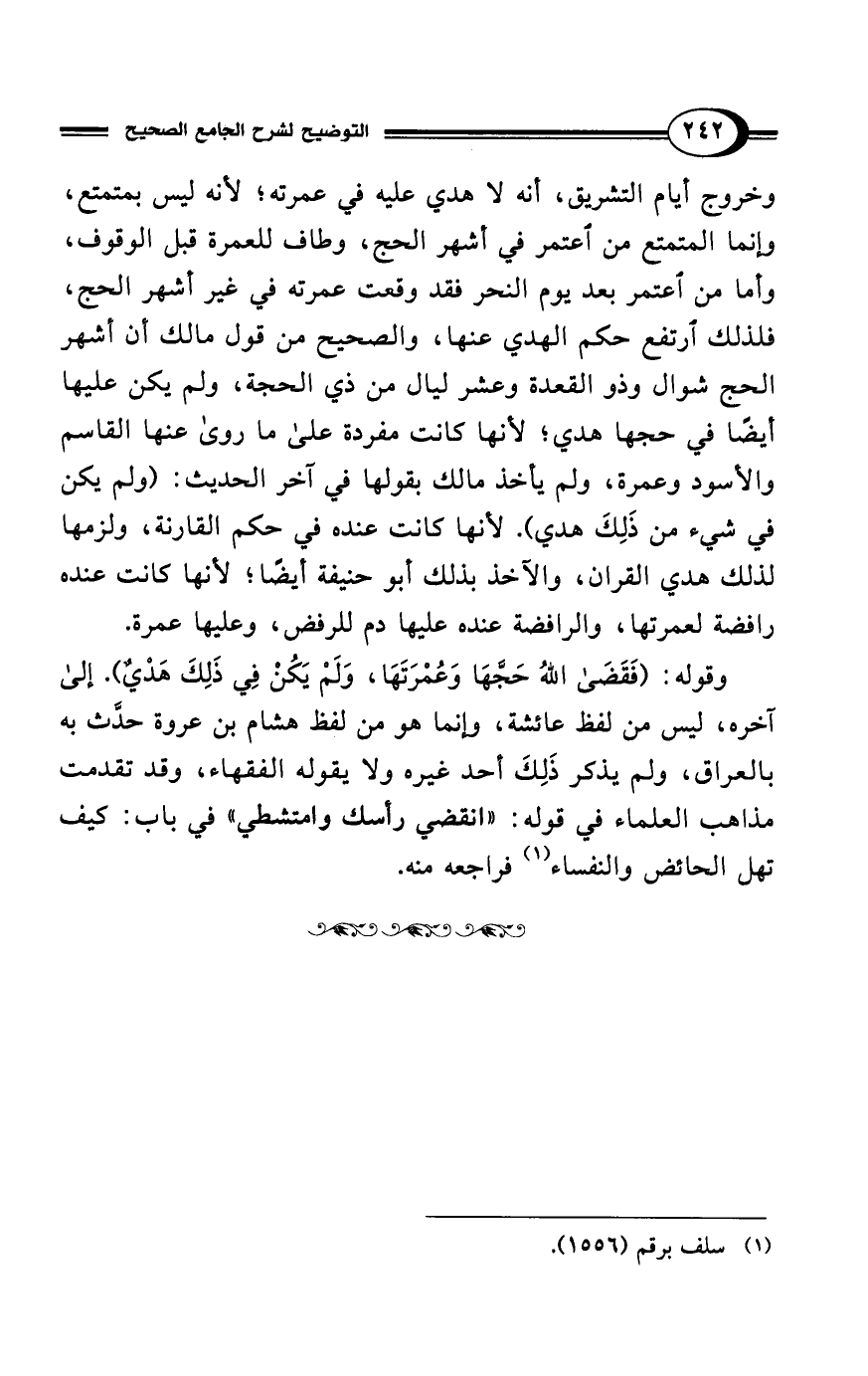 وخروج أيام التشريق، أنه لا هدي عليه في عمرته؛ لأنه ليس بمتمتع، وإنما المتمتع من اعتمر في أشهر الحج، وطاف للعمرة قبل الوقوف، وأما من اعتمر بعد يوم النحر فقد وقعت عمرته في غير أشهر الحج، فلذلك ارتفع حكم الهدي عنها، والصحيح من قول مالك أن أشهر الحج شوال وذو القعدة وعشر ليال من ذي الحجة، ولم يكن عليها أيضًا في حجها هدي؛ لأنها كانت مفردة على ما روى عنها القاسم والأسود وعمرة، ولم يأخذ مالك بقولها في آخر الحديث: (ولم يكن في شيء من ذَلِكَ هدي). لأنها كانت عنده في حكم القارنة، ولزمها لذلك هدي القرآن، والآخذ بذلك أبو حنيفة أيضًا؛ لأنها كانت عنده رافضة لعمرتها، والرافضة عنده عليها دم للرفض، وعليها عمرة.