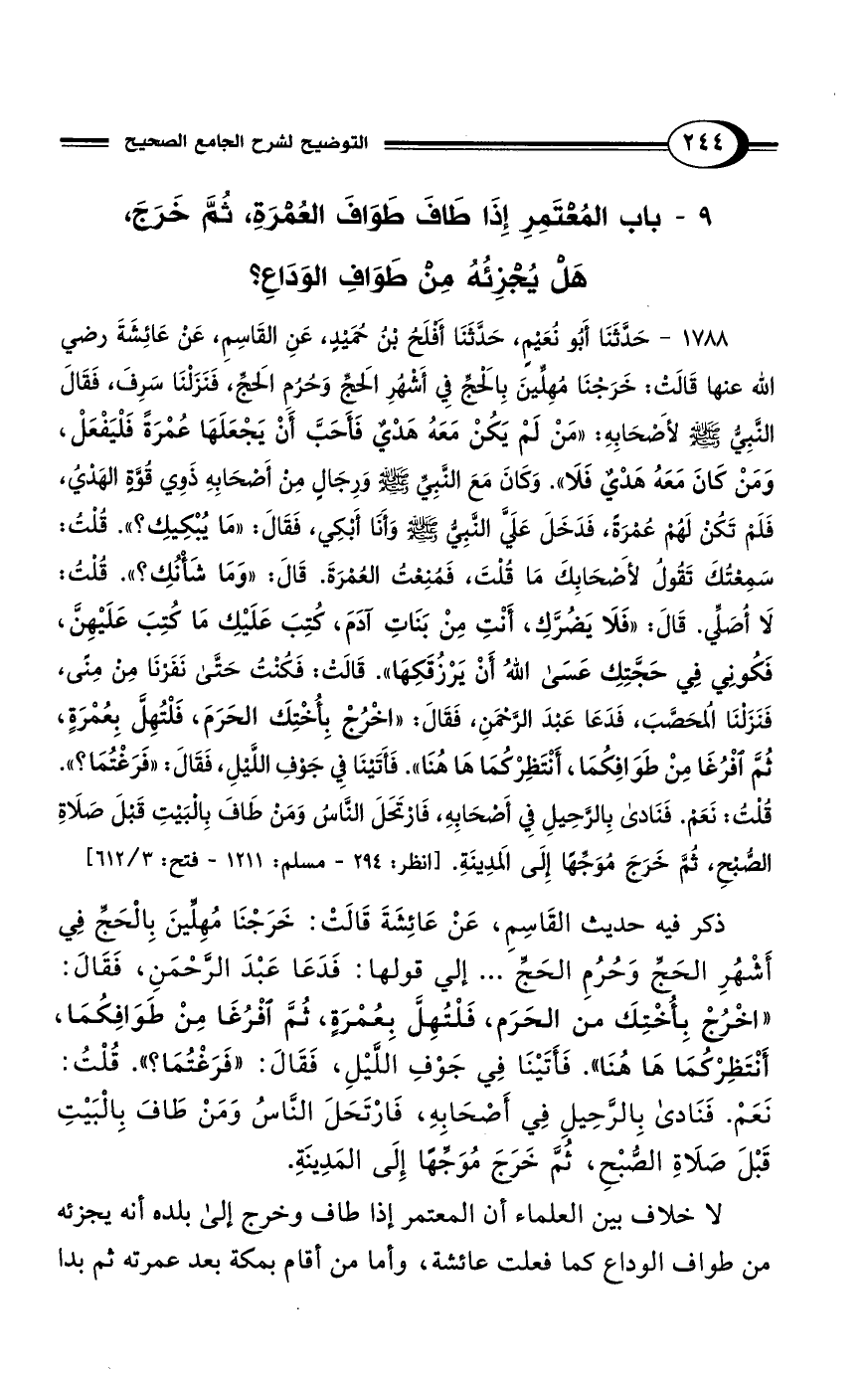 ذكر فيه حديث القَاسِمِ، عَنْ عَائِشَةَ قَالَتْ: خَرَجْنَا مُهِلِّينَ بِالحَجِّ فِي أَشْهُرِ الحَجِّ وَحُرُمِ الحَجِّ ... إلى قولها: فَدَعَا عَبْدَ الرَّحْمَنِ، فَقَالَ: "اخْرُجْ بِأُخْتِكَ من الحَرَم، فَلْتُهِلَّ بِعُمْرَةٍ، ثُمَّ افْرُغَا مِنْ طَوَافِكُمَا، أَنْتَظِرْكُمَا هَا هُنَا". فَأَتَيْنَا فِي جَوْفِ اللَّيْلِ، فَقَالَ: "فَرَغْتُمَا؟ ". قُلْتُ: نَعَمْ. فَنَادى بِالرَّحِيلِ فِي أَصْحَابِهِ، فَارْتَحَلَ النَّاسُ وَمَنْ طَافَ بِالبَيْتِ قَبْلَ صَلَاةِ الصُّبْحِ، ثُمَّ خَرَجَ مُوَجِّهًا إِلَى المَدِينَةِ.
