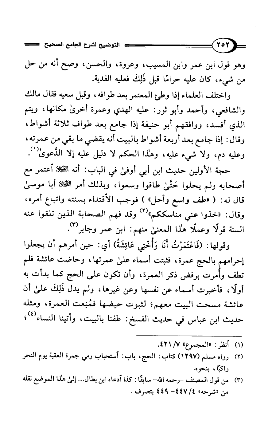 أصحابه ولم يحلوا حَتَّى طافوا وسعوا، وبذلك أمر - عليه السلام - أبا موسى قال له: ("طف واسع وأحل") فوجب الاقتداء بسنته واتباع أمره، وقال: "خذوا عني مناسككم" (¬2) وقد فهم الصحابة الذين تلقوا عنه السنة قولًا وعملًا هذا المعنى منهم: ابن عمر وجابر (¬3).