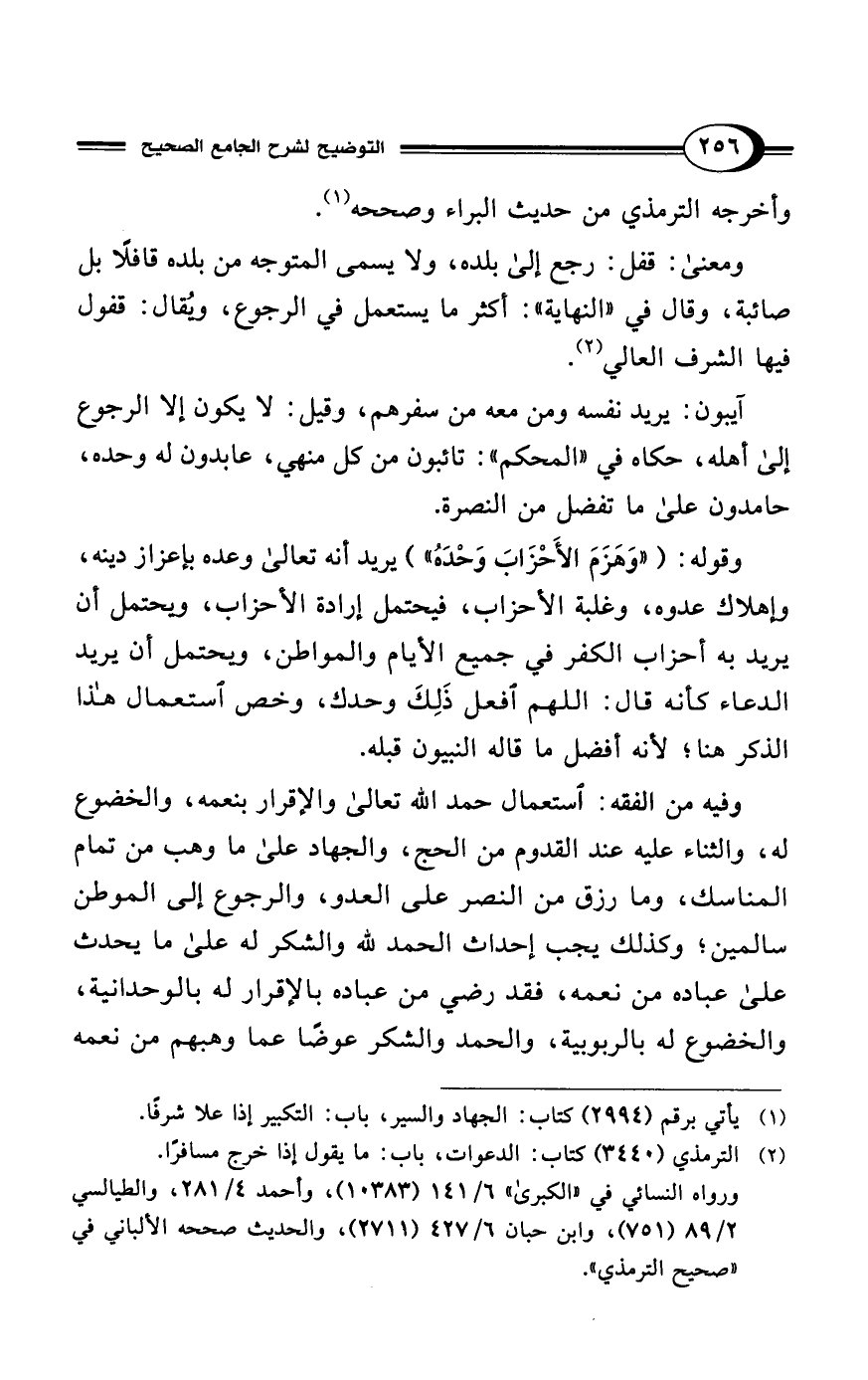 وفيه من الفقه: استعمال حمد الله تعالى والإقرار بنعمه، والخضوع له، والثناء عليه عند القدوم من الحج، والجهاد على ما وهب من تمام المناسك، وما رزق من النصر على العدو، والرجوع إلى الموطن سالمين؛ وكذلك يجب إحداث الحمد لله والشكر له على ما يحدث على عباده من نعمه، فقد رضي من عباده بالإقرار له بالوحدانية، والخضوع له بالربوبية، والحمد والشكر عوضًا عما وهبهم من نعمه