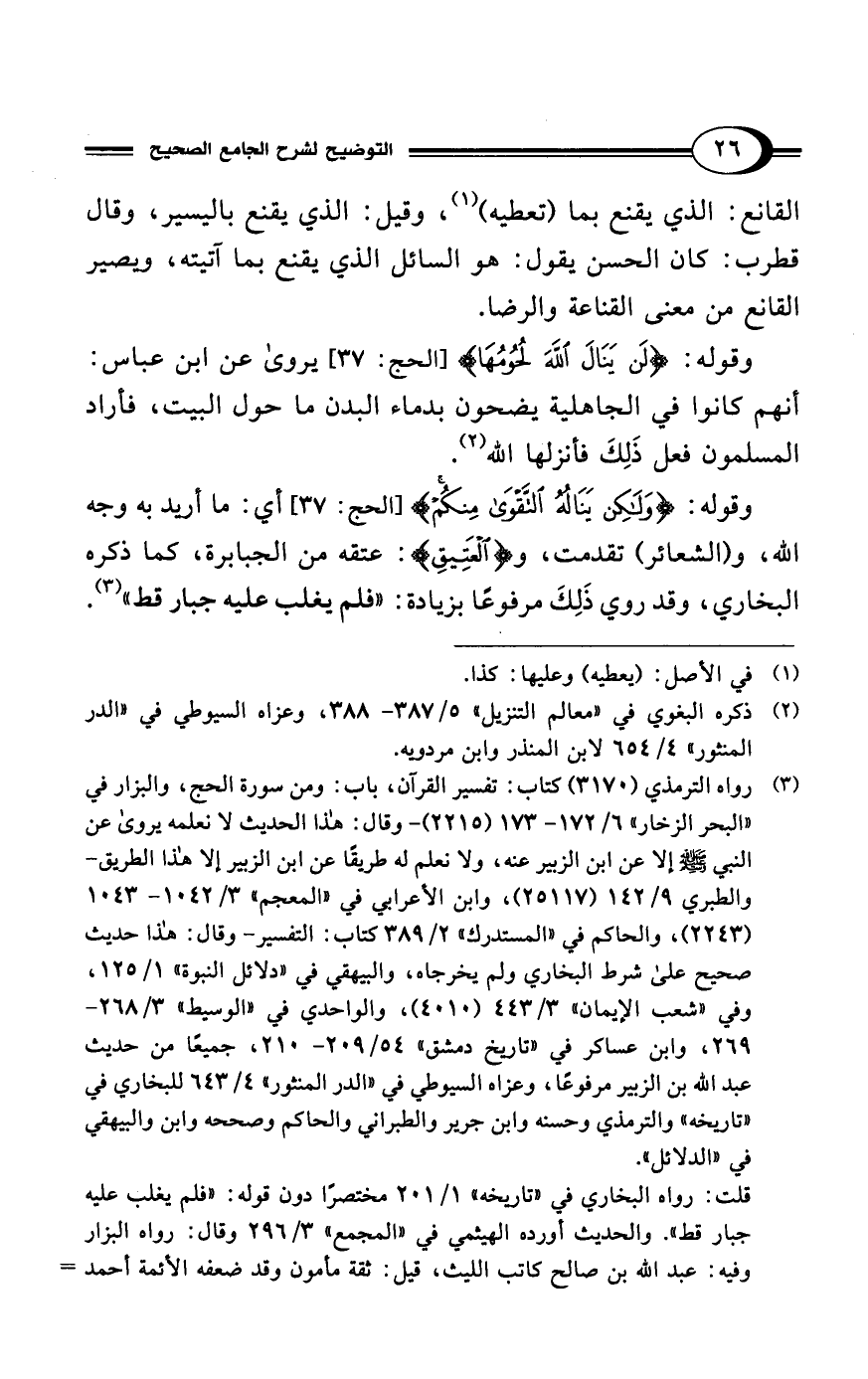 وقوله: {وَلَكِنْ يَنَالُهُ التَّقْوَى مِنْكُمْ} [الحج: 37] أي: ما أريد به وجه الله، و (الشعائر) تقدمت، و {العَتِيقِ}: عتقه من الجبابرة، كما ذكره البخاري، وقد روي ذَلِكَ مرفوعًا بزيادة: "فلم يغلب عليه جبار قط" (¬3).