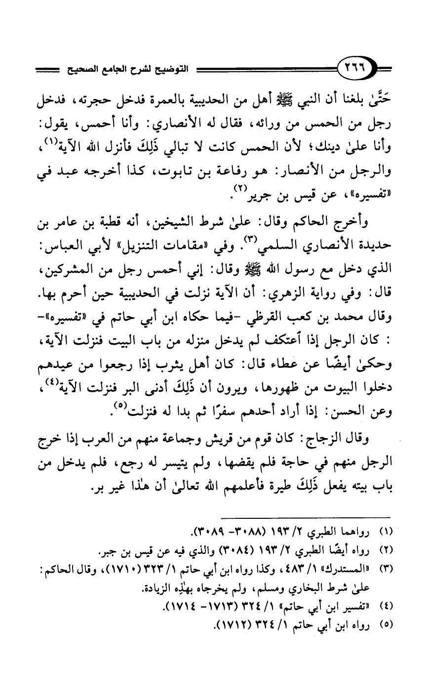 حَتَّى بلغنا أن النبي - صلى الله عليه وسلم - أهل من الحديبية بالعمرة فدخل حجرته، فدخل رجل من الحمس من ورائه، فقال له الأنصاري: وأنا أحمس، يقول: وأنا على دينك؛ لأن الحمس كانت لا تبالي ذَلِكَ فأنزل الله الآية (¬1)، والرجل من الأنصار: هو رفاعة بن تابوت، كذا أخرجه عبد في "تفسيره"، عن قيس بن جرير (¬2).