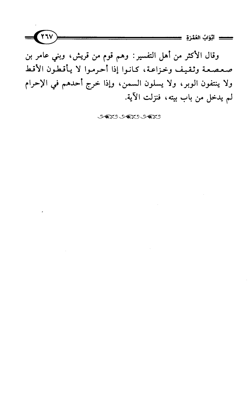وقال الأكثر من أهل التفسير: وهم قوم من قريش، وبني عامر بن صعصعة وثقيف وخزاعة، كانوا إذا أحرموا لا يأقطون الأقط ولا ينتفون الوبر، ولا يسلون السمن، وإذا خرج أحدهم في الإحرام لم يدخل من باب بيته، فنزلت الآية.