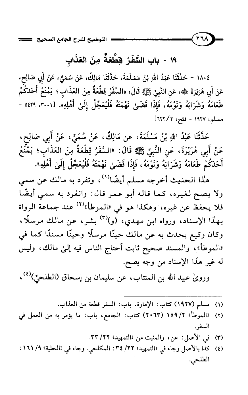 1804 - حَدَّثَنَا عَبْدُ اللهِ بْنُ مَسْلَمَةَ، حَدَّثَنَا مَالِكٌ، عَنْ سُمَيٍّ، عَنْ أَبِي صَالِحٍ، عَنْ أَبِي هُرَيْرَةَ - رضي الله عنه -، عَنِ النَّبِيِّ - صلى الله عليه وسلم - قَالَ: "السَّفَرُ قِطْعَةٌ مِنَ العَذَابِ؛ يَمْنَعُ أَحَدَكُمْ طَعَامَهُ وَشَرَابَهُ وَنَوْمَهُ، فَإِذَا قَضَى نَهْمَتَهُ فَلْيُعَجِّلْ إِلَى أَهْلِهِ". [3001، 5429 - مسلم: 1927 - فتح: 3/ 622]