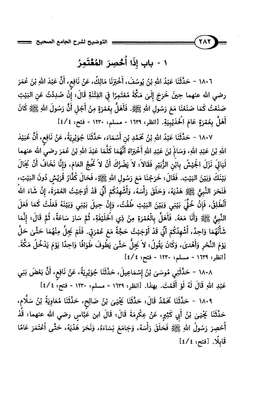 1806 - حَدَّثَنَا عَبْدُ اللهِ بْنُ يُوسُفَ، أَخْبَرَنَا مَالِكٌ، عَنْ نَافِعٍ، أَنَّ عَبْدَ اللهِ بْنَ عُمَرَ رضي الله عنهما حِينَ خَرَجَ إِلَى مَكَّةَ مُعْتَمِرًا فِي الفِتْنَةِ قَالَ: إِنْ صُدِدْتُ عَنِ البَيْتِ صَنَعْتُ كَمَا صَنَعْنَا مَعَ رَسُولِ اللهِ - صلى الله عليه وسلم -. فَأَهَلَّ بِعُمْرَةٍ مِنْ أَجْلِ أَنَّ رَسُولَ اللهِ - صلى الله عليه وسلم - كَانَ أَهَلَّ بِعُمْرَةٍ عَامَ الحُدَيْبِيَةِ. [انظر: 1639 - مسلم: 1230 - فتح: 4/ 4]