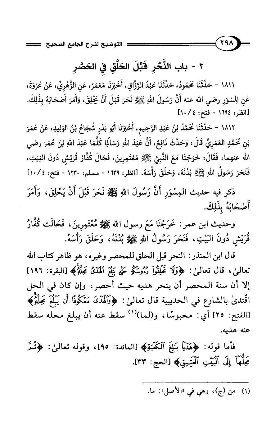 1812 - حَدَّثَنَا مُحَمَّدُ بْنُ عَبْدِ الرَّحِيمِ، أَخْبَرَنَا أَبُو بَدْرٍ شُجَاعُ بْنُ الوَلِيدِ، عَنْ عُمَرَ بْنِ مُحَمَّدٍ العُمَرِيِّ قَالَ: وَحَدَّثَ نَافِعٌ، أَنَّ عَبْدَ اللهِ وَسَالِمًا كَلَّمَا عَبْدَ اللهِ بْنَ عُمَرَ رضي الله عنهما، فَقَالَ: خَرَجْنَا مَعَ النَّبِيِّ - صلى الله عليه وسلم - مُعْتَمِرِينَ، فَحَالَ كُفَّارُ قُرَيْشٍ دُونَ البَيْتِ، فَنَحَرَ رَسُولُ اللهِ - صلى الله عليه وسلم - بُدْنَهُ، وَحَلَقَ رَأْسَهُ. [انظر: 1639 - مسلم: 1230 - فتح: 4/ 10]