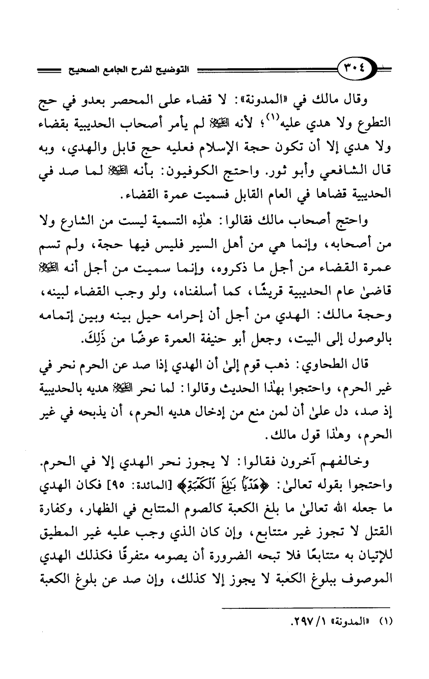 واحتج أصحاب مالك فقالوا: هذِه التسمية ليست من الشارع ولا من أصحابه، وإنما هي من أهل السير فليس فيها حجة، ولم تسم عمرة القضاء من أجل ما ذكروه، وإنما سميت من أجل أنه - عليه السلام - قاضى عام الحديبية قريشًا، كما أسلفناه، ولو وجب القضاء لبينه، وحجة مالك: الهدي من أجل أن إحرامه حيل بينه وبين إتمامه بالوصول إلى البيت، وجعل أبو حنيفة العمرة عوضًا من ذَلِكَ.