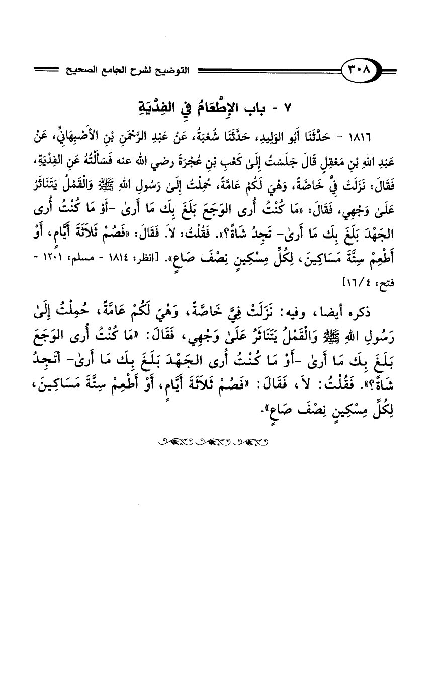 1816 - حَدَّثَنَا أَبُو الوَلِيدِ حَدَّثَنَا شُعْبَةُ، عَنْ عَبْدِ الرَّحْمَنِ بْنِ الأَصْبِهَانِيِّ، عَنْ عَبْدِ اللهِ بْنِ مَعْقِلٍ قَالَ جَلَسْتُ إِلَى كَعْبِ بْنِ عُجْرَةَ رضي الله عنه فَسَأَلْتُهُ عَنِ الفِدْيَةِ، فَقَالَ: نَزَلَتْ فِيَّ خَاصَّةً، وَهْيَ لَكُمْ عَامَّةً، حُمِلْتُ إِلَى رَسُولِ اللهِ - صلى الله عليه وسلم - وَالقَمْلُ يَتَنَاثَرُ عَلَى وَجْهِي فَقَالَ: "مَا كُنْتُ أُرَى الوَجَعَ بَلَغَ بِكَ مَا أَرَى -أَوْ مَا كُنْتُ أُرَى الجَهْدَ بَلَغَ بِكَ مَا أَرَى- تَجِدُ شَاةً؟ ". فَقُلْتُ: لاَ. قَالَ: "فَصُمْ ثَلاَثَةَ أَيَّامٍ، أَوْ أَطْعِمْ سِتَّةَ مَسَاكِينَ، لِكُلِّ مِسْكِينٍ نِصْفَ صَاعٍ". [انظر: 1814 - مسلم: 1201 - فتح: 4/ 16]