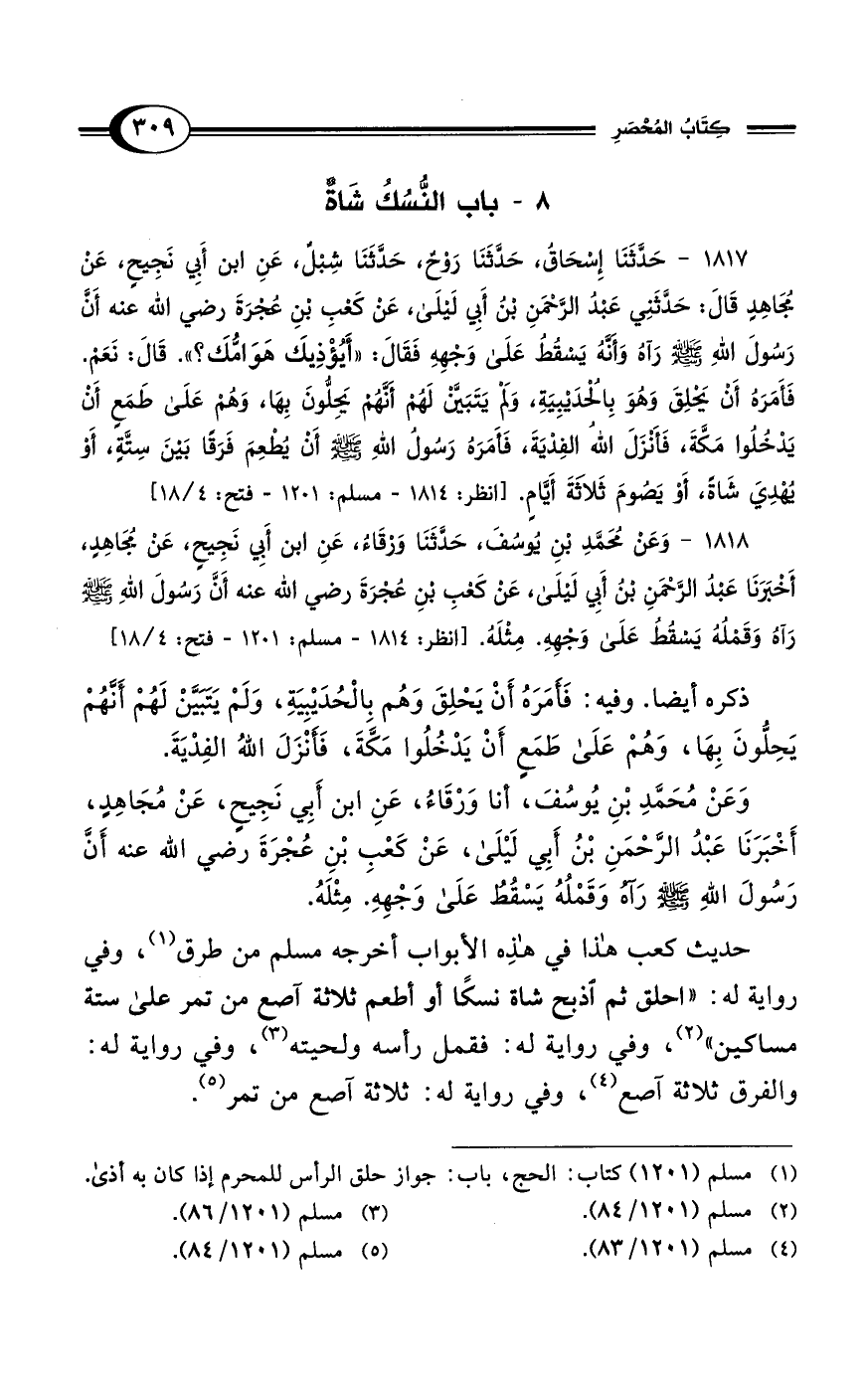 1818 - وَعَنْ مُحَمَّدِ بْنِ يُوسُفَ، حَدَّثَنَا وَرْقَاءُ، عَنِ ابْنِ أَبِي نَجِيحٍ، عَنْ مُجَاهِدٍ، أَخْبَرَنَا عَبْدُ الرَّحْمَنِ بْنُ أَبِي لَيْلَى، عَنْ كَعْبِ بْنِ عُجْرَةَ رضي الله عنه أَنَّ رَسُولَ اللهِ - صلى الله عليه وسلم - رَآهُ وَقَمْلُهُ يَسْقُطُ عَلَى وَجْهِهِ. مِثْلَهُ. [انظر: 1814 - مسلم: 1201 - فتح: 4/ 18]