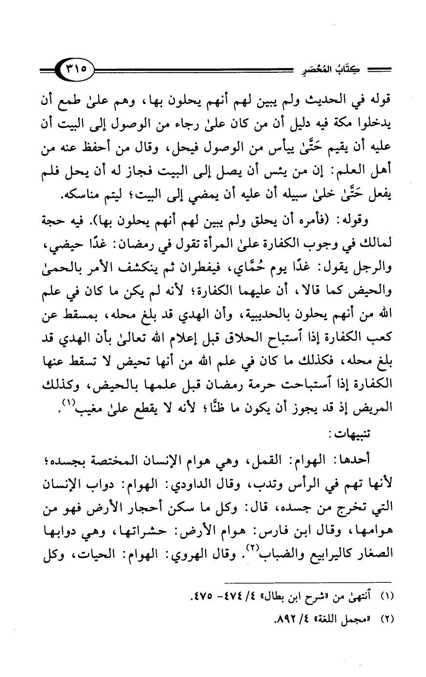 أحدها: الهوام: القمل، وهي هوام الإنسان المختصة بجسده؛ لأنها تهم في الرأس وتدب، وقال الداودي: الهوام: دواب الإنسان التي تخرج من جسده، قال: وكل ما سكن أحجار الأرض فهو من هوامها، وقال ابن فارس: هوام الأرض: حشراتها، وهي دوابها الصغار كاليرابيع والضباب (¬2). وقال الهروي: الهوام: الحيات، وكل