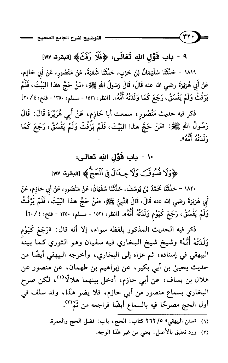 ذكر فيه حديث مَنْصُورٍ، سمعت أبا حَازِمٍ، عَنْ أَبِي هُرَيْرَةَ قَالَ: قَالَ رَسُولُ اللهِ - صلى الله عليه وسلم -: "مَنْ حَجَّ هذا البَيْتَ، فَلَمْ يَرْفُثْ وَلَمْ يَفْسُقْ، رَجَعَ كَمَا وَلَدَتْهُ أُمُّهُ".