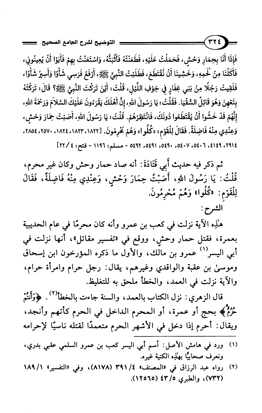 ثم ذكر فيه حديث أَبِي قَتَادَةَ: أنه صاد حمار وحش وكان غير محرم، قُلْتُ: يَا رَسُولَ الله، أَصَبْتُ حِمَارَ وَحْشٍ، وَعِنْدِي مِنْهُ فَاضِلَةٌ، فَقَالَ لِلْقَوْمِ: "كُلُوا" وَهُمْ مُحْرِمُونَ.