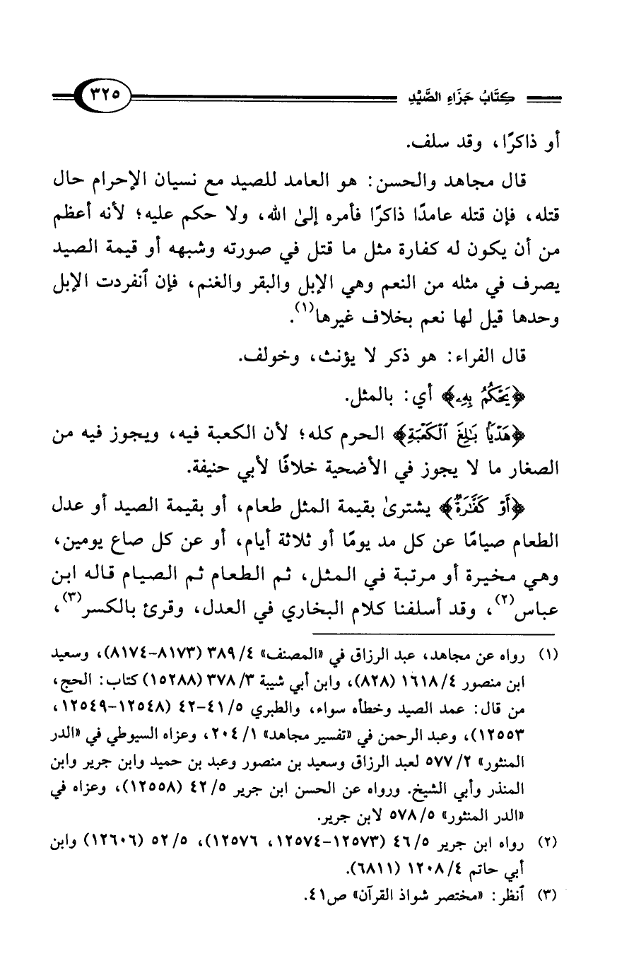 (¬1) رواه عن مجاهد، عبد الرزاق في "المصنف" 4/ 389 (8173 - 8174)، وسعيد ابن منصور 4/ 1618 (828)، وابن أبي شيبة 3/ 378 (15288) كتاب: الحج، من قال: عمد الصيد وخطأه سواء، والطبري 5/ 41 - 42 (12548 - 12549، 12553)، وعبد الرحمن في "تفسير مجاهد" 1/ 204، وعزاه السيوطي في "الدر المنثور" 2/ 577 لعبد الرزاق وسعيد بن منصور وعبد بن حميد وابن جرير وابن المنذر وأبي الشيخ. ورواه عن الحسن ابن جرير 5/ 42 (12558)، وعزاه في "الدر المنثور" 5/ 578 لابن جرير.
