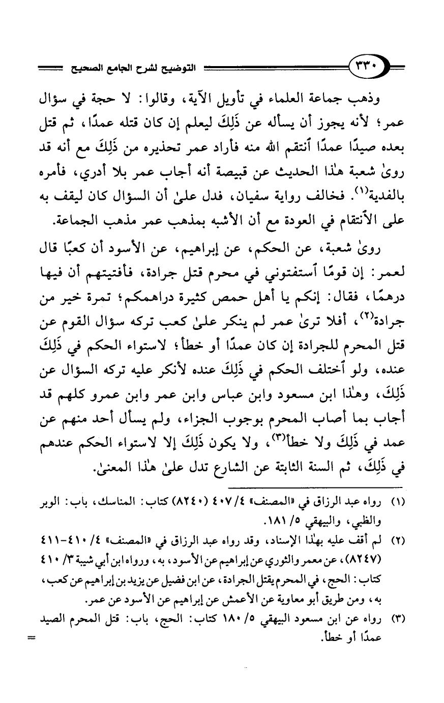 روى شعبة، عن الحكم، عن إبراهيم، عن الأسود أن كعبًا قال لعمر: إن قومًا استفتوني في محرم قتل جرادة، فأفتيتهم أن فيها درهمًا، فقال: إنكم يا أهل حمص كثيرة دراهمكم؛ تمرة خير من جرادة (¬2)، أفلا ترى عمر لم ينكر على كعب تركه سؤال القوم عن قتل المحرم للجرادة إن كان عمدًا أو خطأ؛ لاستواء الحكم في ذَلِكَ عنده، ولو اختلف الحكم في ذَلِكَ عنده لأنكر عليه تركه السؤال عن ذَلِكَ، وهذا ابن مسعود وابن عباس وابن عمر وابن عمرو كلهم قد أجاب بما أصاب المحرم بوجوب الجزاء، ولم يسأل أحد منهم عن عمد في ذَلِكَ ولا خطأ (¬3)، ولا يكون ذَلِكَ إلا لاستواء الحكم عندهم في ذَلِكَ، ثم السنة الثابتة عن الشارع تدل على هذا المعنى.