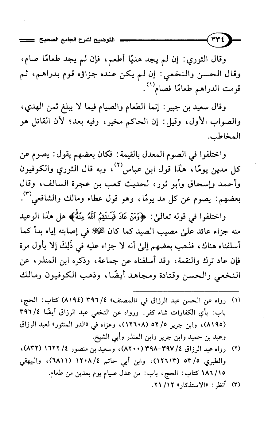 (¬2) رواه عبد الرزاق 4/ 397 - 398 (8200)، وسعيد بن منصور 4/ 1622 (832)، والطبري 5/ 53 (12613)، وابن أبي حاتم 4/ 1208 (6811)، والبيهقي 15/ 186 كتاب: الحج، باب: من عدل صيام يوم بمدين من طعام.