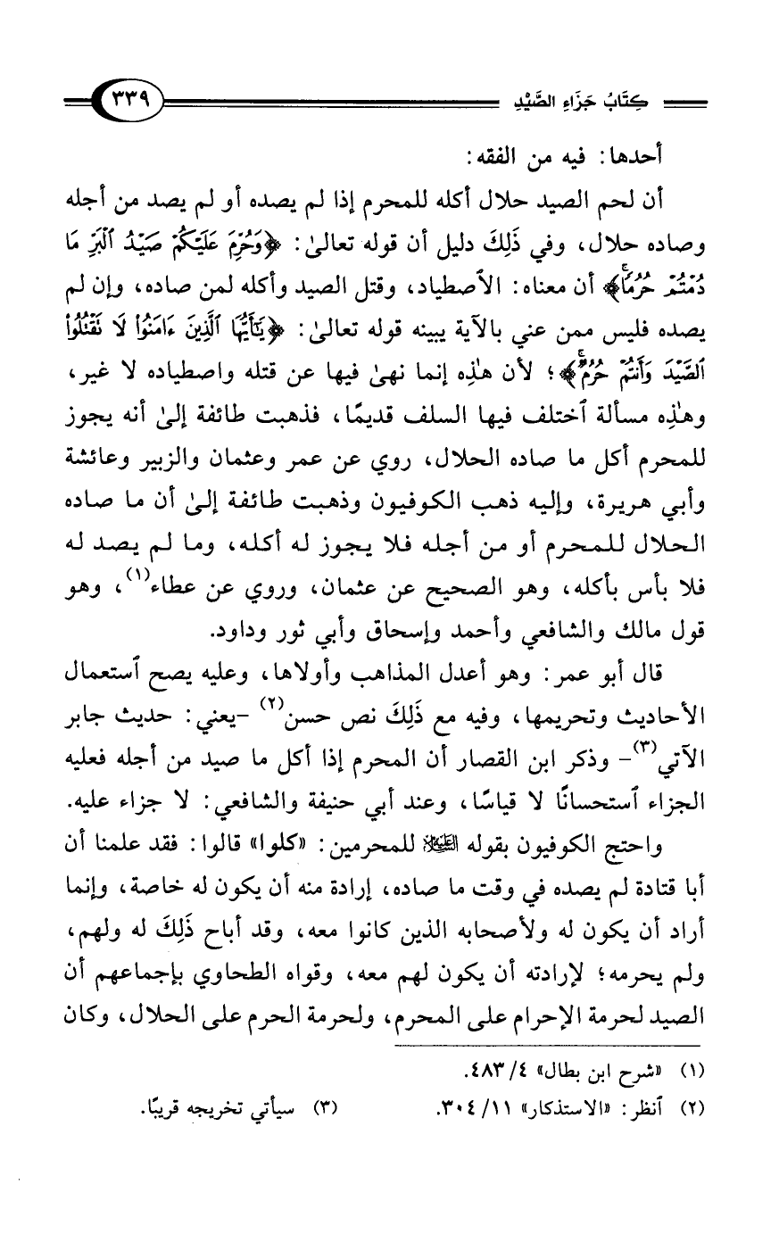 قال أبو عمر: وهو أعدل المذاهب وأولاها، وعليه يصح استعمال الأحاديث وتحريمها، وفيه مع ذَلِكَ نص حسن (¬2) -يعني: حديث جابر الآتي (¬3) - وذكر ابن القصار أن المحرم إذا أكل ما صيد من أجله فعليه الجزاء استحسانًا لا قياسًا، وعند أبي حنيفة والشافعي: لا جزاء عليه.