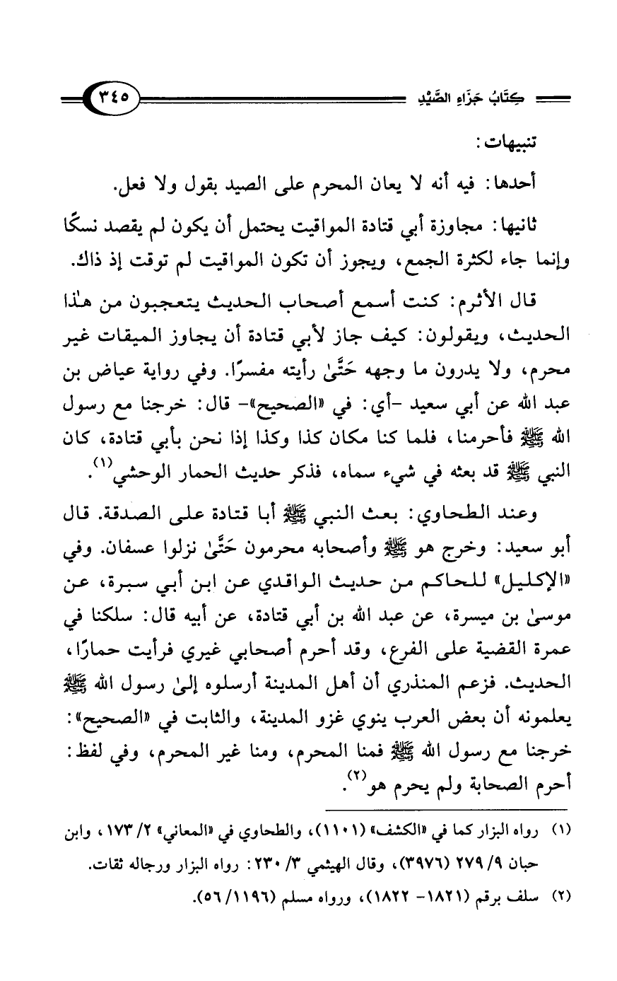 قال الأثرم: كنت أسمع أصحاب الحديث يتعجبون من هذا الحديث، ويقولون: كيف جاز لأبي قتادة أن يجاوز الميقات غير محرم، ولا يدرون ما وجهه حَتَّى رأيته مفسرًا. وفي رواية عياض بن عبد الله عن أبي سعيد -أي: في "الصحيح"- قال: خرجنا مع رسول الله - صلى الله عليه وسلم - فأحرمنا، فلما كنا مكان كذا وكذا إذا نحن بأبي قتادة، كان النبي - صلى الله عليه وسلم - قد بعثه في شيء سماه، فذكر حديث الحمار الوحشي (¬1).