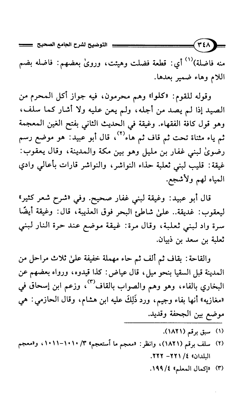 وقوله للقوم: "كلوا" وهم محرمون، فيه جواز أكل المحرم من الصيد إذا لم يصد من أجله، ولم يعن عليه ولا أشار كما سلف، وهو قول كافة الفقهاء. وغيقة في الحديث الثاني بفتح الغين المعجمة ثم ياء مثناة تحت ثم قاف ثم هاء (¬2)، قال أبو عبيد: هو موضع رسم رضوى لبني غفار بن مليل وهو بين مكة والمدينة، وقال يعقوب: غيقة: قليب لبني ثعلبة حذاء النواشر، والنواشر قارات بأعالي وادي المياه لهم ولأشجع.