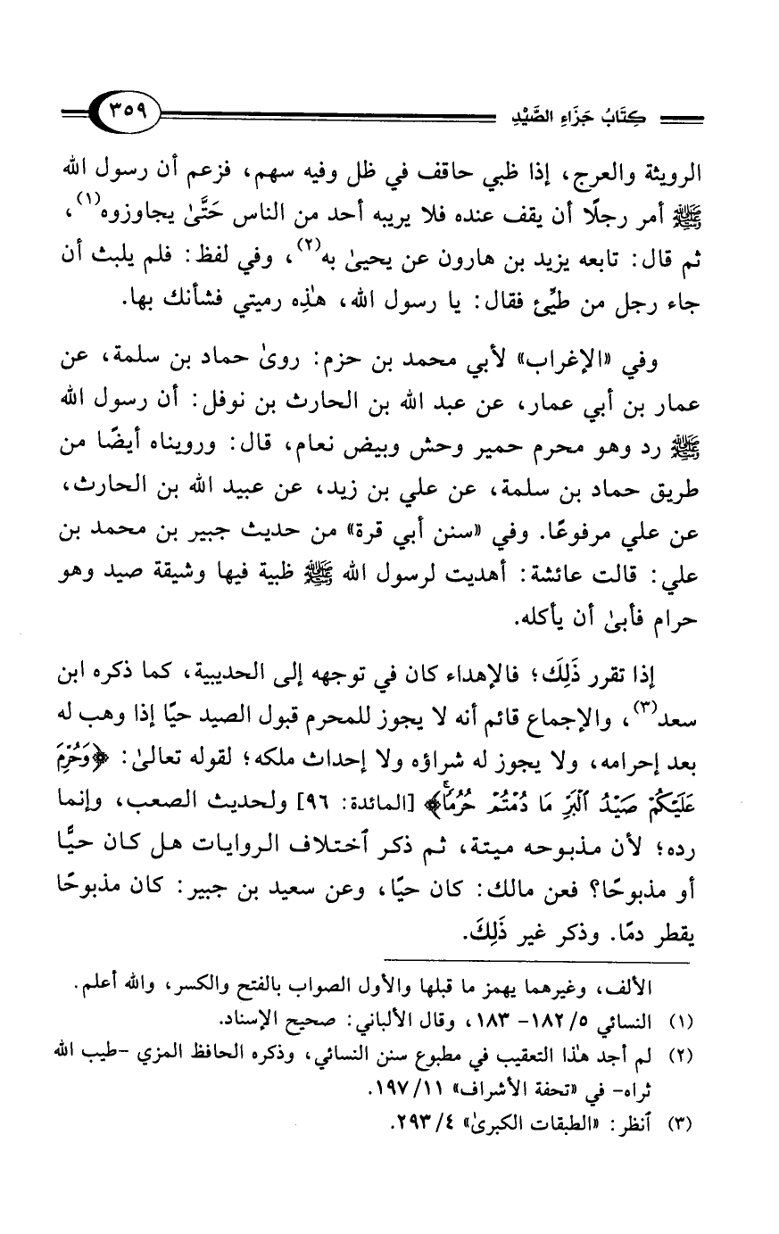 وفي "الإغراب" لأبي محمد بن حزم: روى حماد بن سلمة، عن عمار بن أبي عمار، عن عبد الله بن الحارث بن نوفل: أن رسول الله - صلى الله عليه وسلم - رد وهو محرم حمير وحش وبيض نعام، قال: ورويناه أيضًا من طريق حماد بن سلمة، عن علي بن زيد، عن عبيد الله بن الحارث، عن علي مرفوعًا. وفي "سنن أبي قرة" من حديث جبير بن محمد بن علي: قالت عائشة: أهديت لرسول الله - صلى الله عليه وسلم - ظبية فيها وشيقة صيد وهو حرام فأبى أن يأكله.