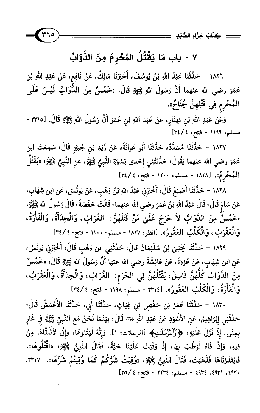 1826 - حَدَّثَنَا عَبْدُ اللهِ بْنُ يُوسُفَ، أَخْبَرَنَا مَالِكٌ، عَنْ نَافِعٍ عَنْ عَبْدِ اللهِ بْنِ عُمَرَ رضي الله عنهما أَنَّ رَسُولَ اللهِ - صلى الله عليه وسلم - قَالَ: "خَمْسٌ مِنَ الدَّوَابِّ لَيْسَ عَلَى المُحْرِمِ فِي قَتْلِهِنَّ جُنَاحٌ".