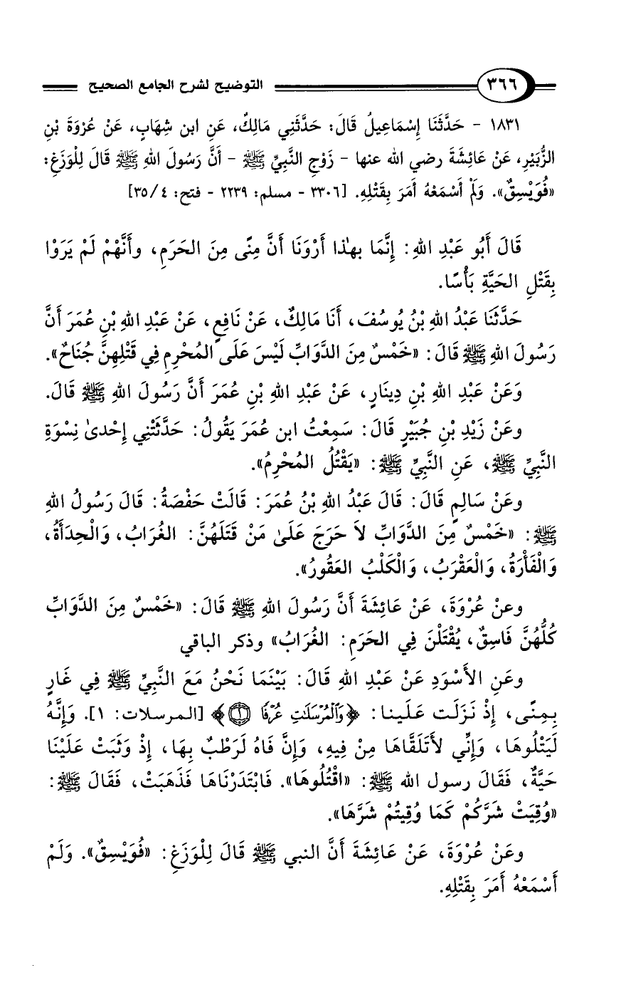 1831 - حَدَّثَنَا إِسْمَاعِيلُ قَالَ: حَدَّثَنِي مَالِكٌ، عَنِ ابْنِ شِهَابٍ، عَنْ عُرْوَةَ بْنِ الزُّبَيْرِ، عَنْ عَائِشَةَ رضي الله عنها -زَوْجِ النَّبِيِّ - صلى الله عليه وسلم -- أَنَّ رَسُولَ اللهِ - صلى الله عليه وسلم - قَالَ لِلْوَزَغِ: "فُوَيْسِقٌ". وَلَمْ أَسْمَعْهُ أَمَرَ بِقَتْلِهِ. [3306 - مسلم: 2239 - فتح: 4/ 35]