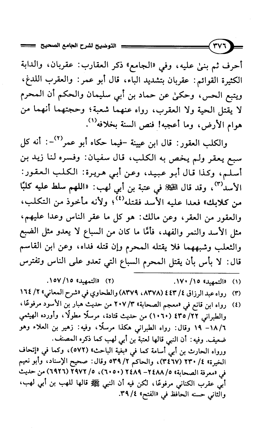 أحرف ثم بني عليه، وفي "الجامع" ذكر العقارب: عقربان، والدابة الكثيرة القوائم: عقربان بتشديد الباء، قال أبو عمر: والعقرب اللدغ، ويتبع الحس، وحكى عن حماد بن أبي سليمان والحكم أن المحرم لا يقتل الحية ولا العقرب، رواه عنهما شعبة؛ وحجتهما أنهما من هوام الأرض، وما أعجبه! فنص السنة بخلافه (¬1).