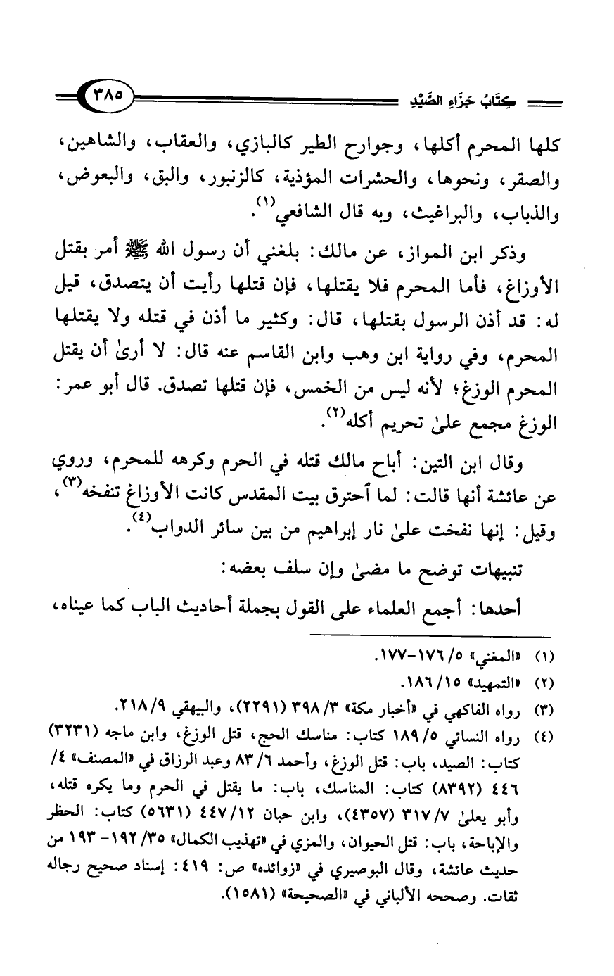 وذكر ابن المواز، عن مالك: بلغني أن رسول الله - صلى الله عليه وسلم - أمر بقتل الأوزاغ، فأما المحرم فلا يقتلها، فإن قتلها رأيت أن يتصدق، قيل له: قد أذن الرسول بقتلها، قال: وكثير ما أذن في قتله ولا يقتلها المحرم، وفي رواية ابن وهب وابن القاسم عنه قال: لا أرى أن يقتل المحرم الوزغ؛ لأنه ليس من الخمس، فإن قتلها تصدق. قال أبو عمر: الوزغ مجمع على تحريم أكله (¬2).