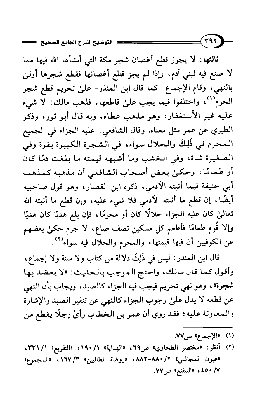 قال ابن المنذر: ليس في ذَلِكَ دلالة من كتاب ولا سنة ولا إجماع، وأقول كما قال مالك، واحتج الموجب بالحديث: "لا يعضد بها شجرة"، وهو نهي تحريم فيجب فيه الجزاء كالصيد، ويجاب بأن النهي عن قطعه لا يدل على وجوب الجزاء كالنهي عن تنفير الصيد والإشارة والمعاونة عليه؛ فقد روي أن عمر بن الخطاب رأى رجلًا يقطع من