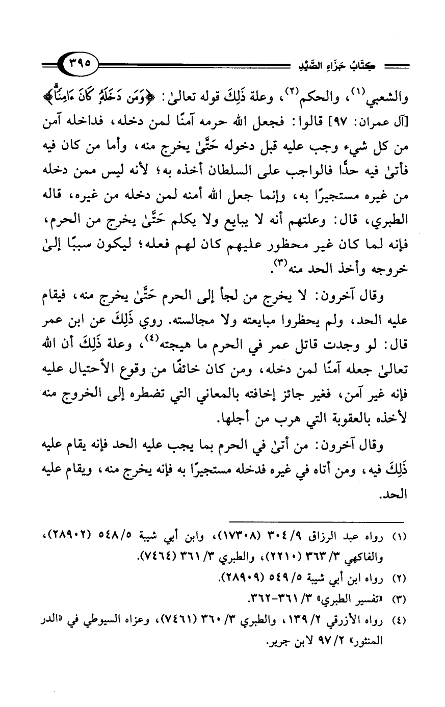 والشعبي (¬1)، والحكم (¬2)، وعلة ذَلِكَ قوله تعالى: {وَمَنْ دَخَلَهُ كَانَ آمِنًا} [آل عمران: 97] قالوا: فجعل الله حرمه آمنًا لمن دخله، فداخله آمن من كل شيء وجب عليه قبل دخوله حَتَّى يخرج منه، وأما من كان فيه فأتى فيه حدًّا فالواجب على السلطان أخذه به؛ لأنه ليس ممن دخله من غيره مستجيرًا به، وإنما جعل الله أمنه لمن دخله من غيره، قاله الطبري، قال: وعلتهم أنه لا يبايع ولا يكلم حَتَّى يخرج من الحرم، فإنه لما كان غير محظور عليهم كان لهم فعله؛ ليكون سببًا إلى خروجه وأخذ الحد منه (¬3).