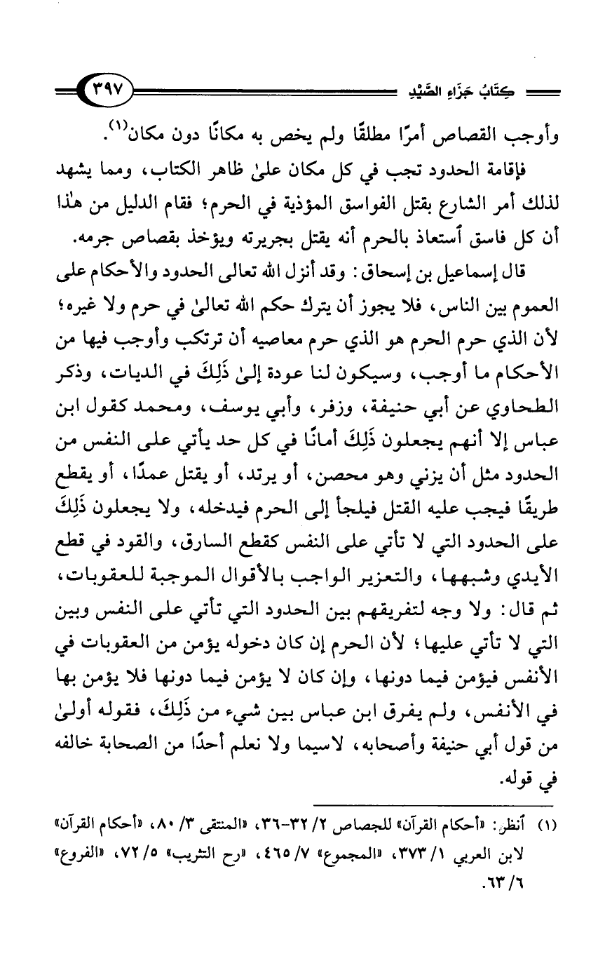 قال إسماعيل بن إسحاق: وقد أنزل الله تعالى الحدود والأحكام على العموم بين الناس، فلا يجوز أن يترك حكم الله تعالى في حرم ولا غيره؛ لأن الذي حرم الحرم هو الذي حرم معاصيه أن ترتكب وأوجب فيها من الأحكام ما أوجب، وسيكون لنا عودة إلى ذَلِكَ في الديات، وذكر الطحاوي عن أبي حنيفة، وزفر، وأبي يوسف، ومحمد كقول ابن عباس إلا أنهم يجعلون ذَلِكَ أمانًا في كل حد يأتي على النفس من الحدود مثل أن يزني وهو محصن، أو يرتد، أو يقتل عمدًا، أو يقطع طريقًا فيجب عليه القتل فيلجأ إلى الحرم فيدخله، ولا يجعلون ذَلِكَ على الحدود التي لا تأتي على النفس كقطع السارق، والقود في قطع الأيدي وشبهها، والتعزير الواجب بالأقوال الموجبة للعقوبات، ثم قال: ولا وجه لتفريقهم بين الحدود التي تأتي على النفس وبين التي لا تأتي عليها؛ لأن الحرم إن كان دخوله يؤمن من العقوبات في الأنفس فيؤمن فيما دونها، وإن كان لا يؤمن فيما دونها فلا يؤمن بها في الأنفس، ولم يفرق ابن عباس بين شيء من ذَلِكَ، فقوله أولى من قول أبي حنيفة وأصحابه، لا سيما ولا نعلم أحدًا من الصحابة خالفه في قوله.