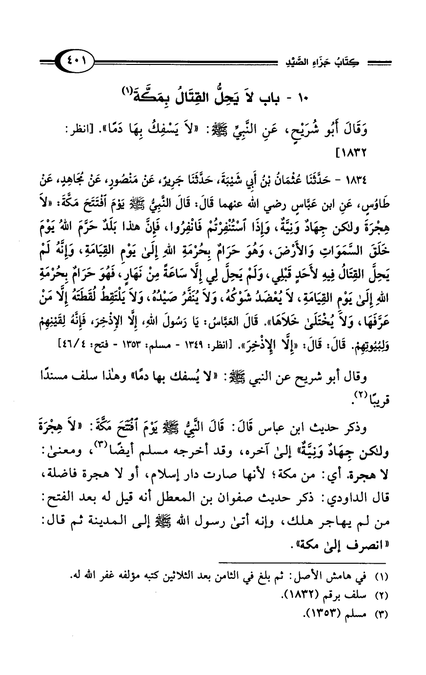 1834 - حَدَّثَنَا عُثْمَانُ بْنُ أَبِي شَيْبَةَ، حَدَّثَنَا جَرِيرٌ، عَنْ مَنْصُورٍ، عَنْ مُجَاهِدٍ، عَنْ طَاوُسٍ، عَنِ ابْنِ عَبَّاسٍ رضي الله عنهما قَالَ: قَالَ النَّبِيُّ - صلى الله عليه وسلم - يَوْمَ افْتَتَحَ مَكَّةَ: "لاَ هِجْرَةَ وَلَكِنْ جِهَادٌ وَنِيَّةٌ، وَإِذَا اسْتُنْفِرْتُمْ فَانْفِرُوا، فَإِنَّ هَذَا بَلَدٌ حَرَّمَ اللهُ يَوْمَ خَلَقَ السَّمَوَاتِ وَالأَرْضَ، وَهُوَ حَرَامٌ بِحُرْمَةِ اللهِ إِلَى يَوْمِ القِيَامَةِ، وَإِنَّهُ لَمْ يَحِلَّ القِتَالُ فِيهِ لأَحَدٍ قَبْلِي، وَلَمْ يَحِلَّ لِي إِلاَّ سَاعَةً مِنْ نَهَارٍ، فَهُوَ حَرَامٌ بِحُرْمَةِ اللهِ إِلَى يَوْمِ القِيَامَةِ، لَا يُعْضَدُ شَوْكُهُ، وَلَا يُنَفَّرُ صَيْدُهُ، وَلَا يَلْتَقِطُ لُقَطَتَهُ إِلَّا مَنْ عَرَّفَهَا، وَلَا يُخْتَلَى خَلاَهَا". قَالَ العَبَّاسُ: يَا رَسُولَ اللهِ، إِلَّا الإِذْخِرَ، فَإِنَّهُ لِقَيْنِهِمْ وَلِبُيُوتِهِمْ. قَالَ: قَالَ: "إِلَّا الإِذْخِرَ". [انظر: 1349 - مسلم: 1353 - فتح: 4/ 46]