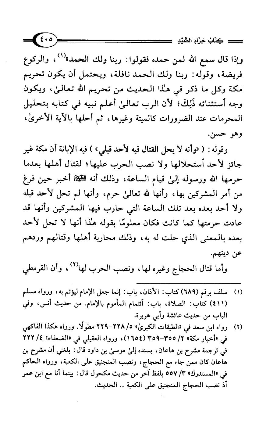 وإذا قال سمع الله لمن حمده فقولوا: ربنا ولك الحمد" (¬1)، والركوع فريضة، وقوله: ربنا ولك الحمد نافلة، ويحتمل أن يكون تحريم مكة وكل ما ذكر في هذا الحديث من تحريم الله تعالى، ويكون وجه استثنائه ذَلِكَ؛ لأن الرب تعالى أعلم نبيه في كتابه بتحليل المحرمات عند الضرورات كالميتة وغيرها، ثم أحلها بالآية الأخرى، وهو حسن.