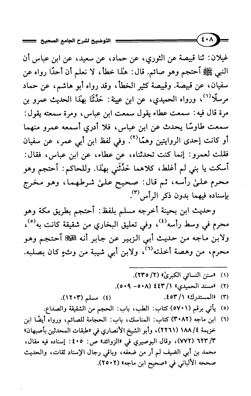 غيلان: ثنا قبيصة عن الثوري، عن حماد، عن سعيد، عن ابن عباس أن النبي - صلى الله عليه وسلم - احتجم وهو صائم. قال: هذا خطأ، لا نعلم أن أحدًا رواه عن سفيان، عن قبيصة. وقبيصة كثير الخطأ، وقد رواه أبو هاشم، عن حماد مرسلًا (¬1)، ورواه الحميدي، عن ابن عيينة: حَدَّثَنَا بهذا الحديث عمرو بن مرة قال فيه: سمعت عطاء يقول سمعت ابن عباس، ومرة سمعته يقول: سمعت طاوسًا يحدث عن ابن عباس، فلا أدري أسمعه عمرو منهما أو كانت إحدى الروايتين وهمًا (¬2). وفي لفظ ابن أبي عمر، عن سفيان فقلت لعمرو: إنما كنت تحدثناه، عن عطاء، عن ابن عباس، فقال: اسكت يا بني لم أغلط، كلاهما حَدَّثَني بهذا. وللحاكم: احتجم وهو محرم على رأسه، ثم قال: صحيح على شرطهما، وهو مخرج بإسناده فيهما بدون ذكر الرأس (¬3).