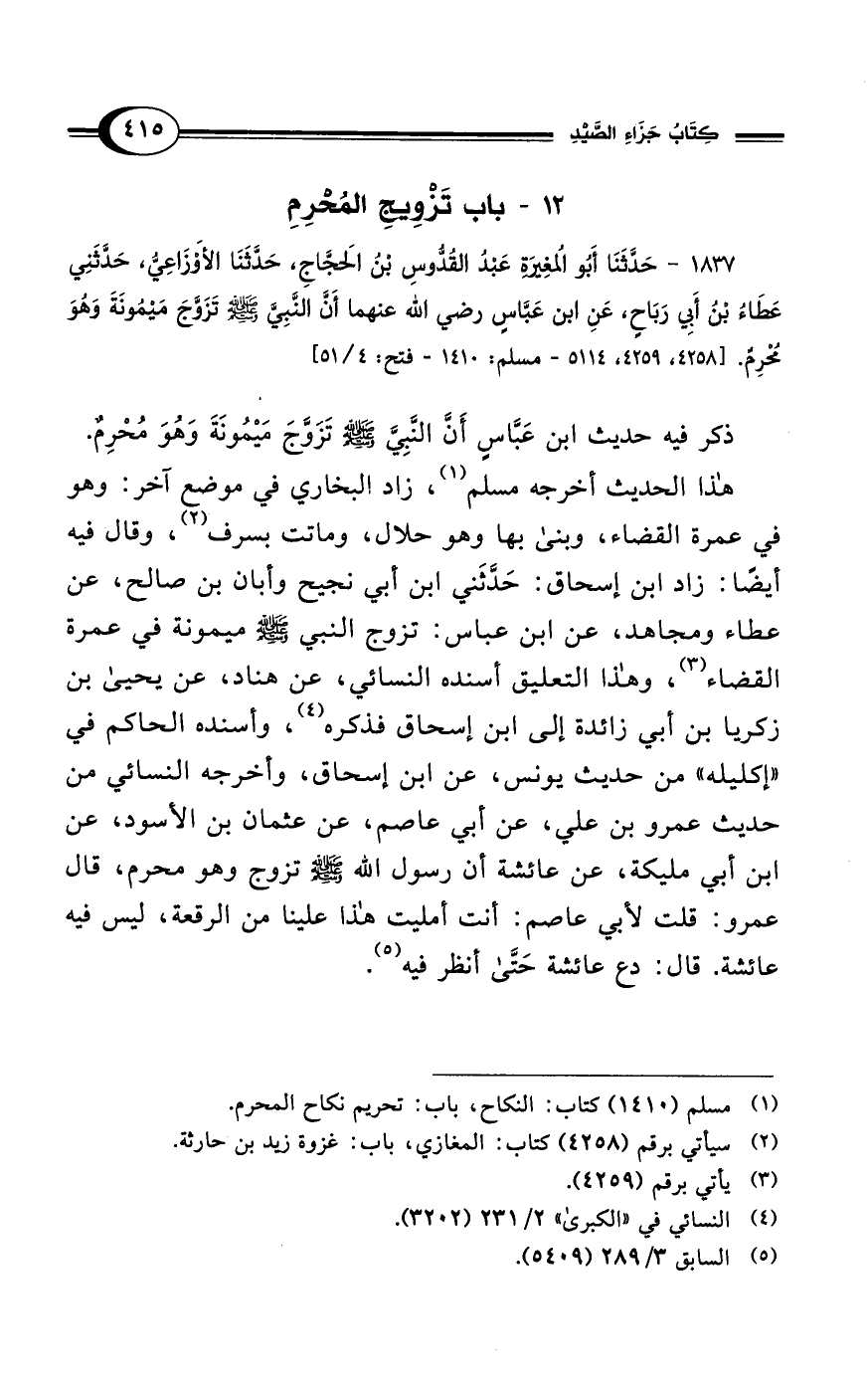 1837 - حَدَّثَنَا أَبُو المُغِيرَةِ عَبْدُ القُدُّوسِ بْنُ الحَجَّاجِ، حَدَّثَنَا الأَوْزَاعِيُّ، حَدَّثَنِي عَطَاءُ بْنُ أَبِي رَبَاحٍ، عَنِ ابْنِ عَبَّاسٍ رضي الله عنهما أَنَّ النَّبِيَّ - صلى الله عليه وسلم - تَزَوَّجَ مَيْمُونَةَ وَهُوَ مُحْرِمٌ. [4258، 4259، 5114 - مسلم: 1410 - فتح: 4/ 51]