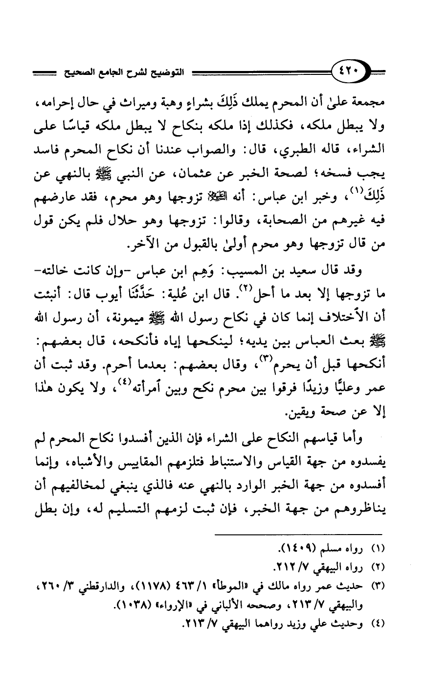 مجمعة على أن المحرم يملك ذَلِكَ بشراءٍ وهبة وميراث في حال إحرامه، ولا يبطل ملكه، فكذلك إذا ملكه بنكاح لا يبطل ملكه قياسًا على الشراء، قاله الطبري، قال: والصواب عندنا أن نكاح المحرم فاسد يجب فسخه؛ لصحة الخبر عن عثمان، عن النبي - صلى الله عليه وسلم - بالنهي عن ذَلِكَ (¬1)، وخبر ابن عباس: أنه - عليه السلام - تزوجها وهو محرم، فقد عارضهم فيه غيرهم من الصحابة، وقالوا: تزوجها وهو حلال فلم يكن قول من قال تزوجها وهو محرم أولى بالقبول من الآخر.