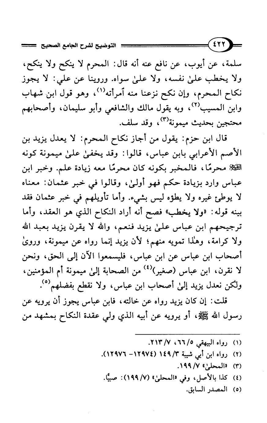 قال ابن حزم: يقول من أجاز نكاح المحرم: لا يعدل يزيد بن الأصم الأعرابي بابن عباس، قالوا: وقد يخفي على ميمونة كونه - عليه السلام - محرمًا، فالمخبر بكونه كان محرمًا معه زيادة علم. وخبر ابن عباس وارد بزيادة حكم فهو أولى، وقالوا في خبر عثمان: معناه لا يوطئ غيره ولا يطؤه ليس بشيء. وأما تأويلهم في خبر عثمان فقد بينه قوله: "ولا يخطب" فصح أنه أراد النكاح الذي هو العقد، وأما ترجيحهم ابن عباس على يزيد فنعم، والله لا يقرن يزيد بعبد الله ولا كرامة، وهذا تمويه منهم؛ لأن يزيد إنما رواه عن ميمونة، وروى أصحاب ابن عباس عن ابن عباس، فليسمعوا الآن إلى الحق، ونحن لا نقرن، ابن عباس (صغير) (¬4) من الصحابة إلى ميمونة أم المؤمنين، ولكن نعدل يزيد إلى أصحاب ابن عباس، ولا نقطع بفضلهم (¬5).