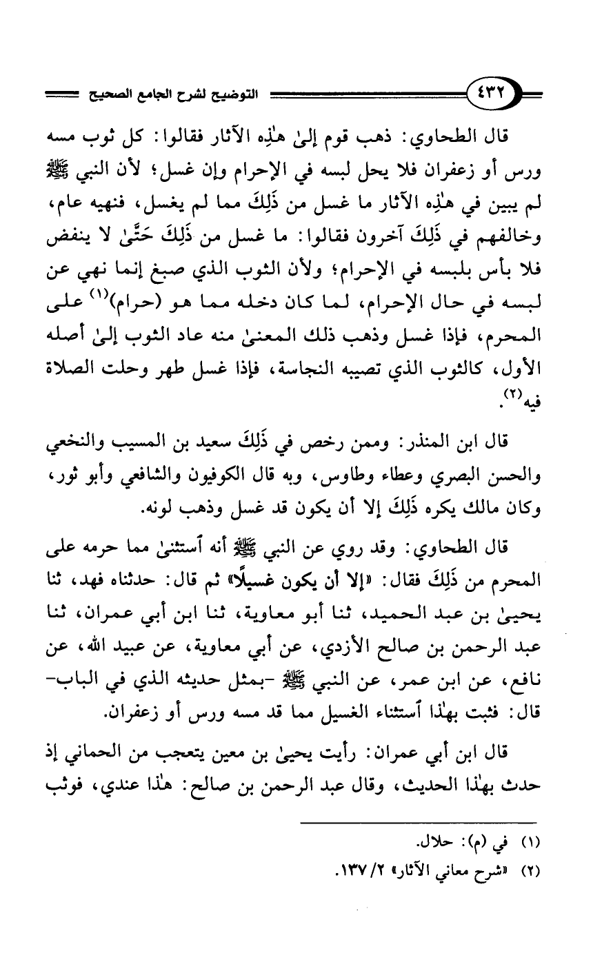 قال الطحاوي: وقد روي عن النبي - صلى الله عليه وسلم - أنه استثنى مما حرمه على المحرم من ذَلِكَ فقال: "إلا أن يكون غسيلًا" ثم قال: حدثناه فهد، ثنا يحيى بن عبد الحميد، ثنا أبو معاوية، ثنا ابن أبي عمران، ثنا عبد الرحمن بن صالح الأزدي، عن أبي معاوية، عن عبيد الله، عن نافع، عن ابن عمر، عن النبي - صلى الله عليه وسلم -بمثل حديثه الذي في الباب- قال: فثبت بهذا استثناء الغسيل مما قد مسه ورس أو زعفران.