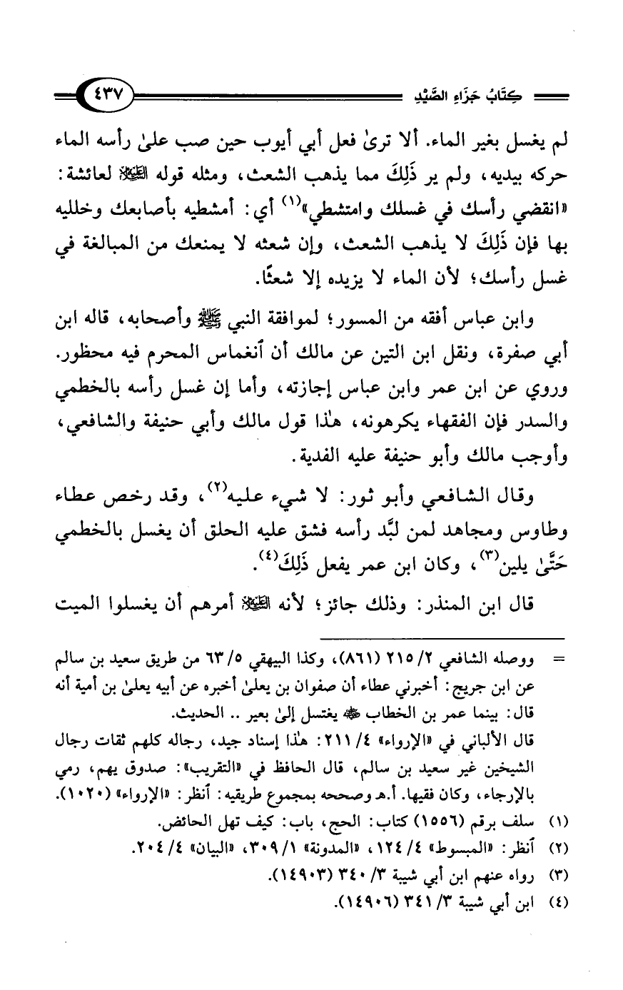 وروي عن ابن عمر وابن عباس إجازته، وأما إن غسل رأسه بالخطمي والسدر فإن الفقهاء يكرهونه، هذا قول مالك وأبي حنيفة والشافعي، وأوجب مالك وأبو حنيفة عليه الفدية.