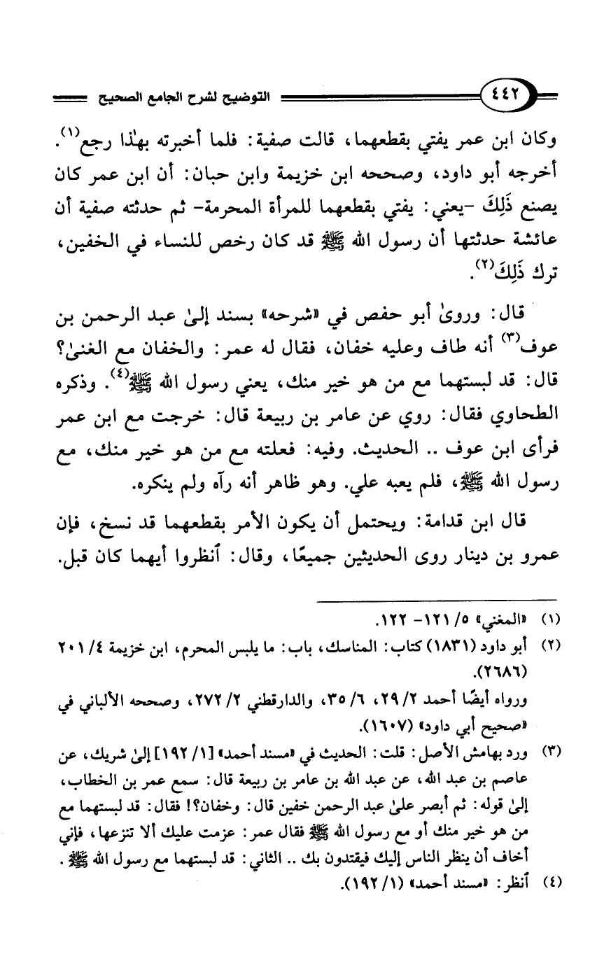 وكان ابن عمر يفتي بقطعهما، قالت صفية: فلما أخبرته بهذا رجع (¬1). أخرجه أبو داود، وصححه ابن خزيمة وابن حبان: أن ابن عمر كان يصنع ذَلِكَ -يعني: يفتي بقطعهما للمرأة المحرمة- ثم حدثته صفية أن عائشة حدثتها أن رسول الله - صلى الله عليه وسلم - قد كان رخص للنساء في الخفين،
