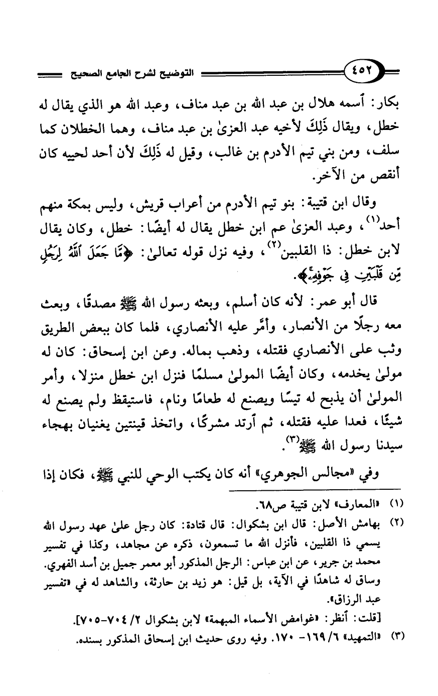 (¬2) بهامش الأصل: قال ابن بشكوال: قال قتادة: كان رجل على عهد رسول الله يسمي ذا القلبين، فأنزل الله ما تسمعون، ذكره عن مجاهد، وكذا في تفسير محمد بن جرير، عن ابن عباس: الرجل المذكور أبو معمر جميل بن أسد الفهري. وساق له شاهدًا في الآية، بل قيل: هو زيد بن حارثة، والشاهد له في "تفسير عبد الرزاق".