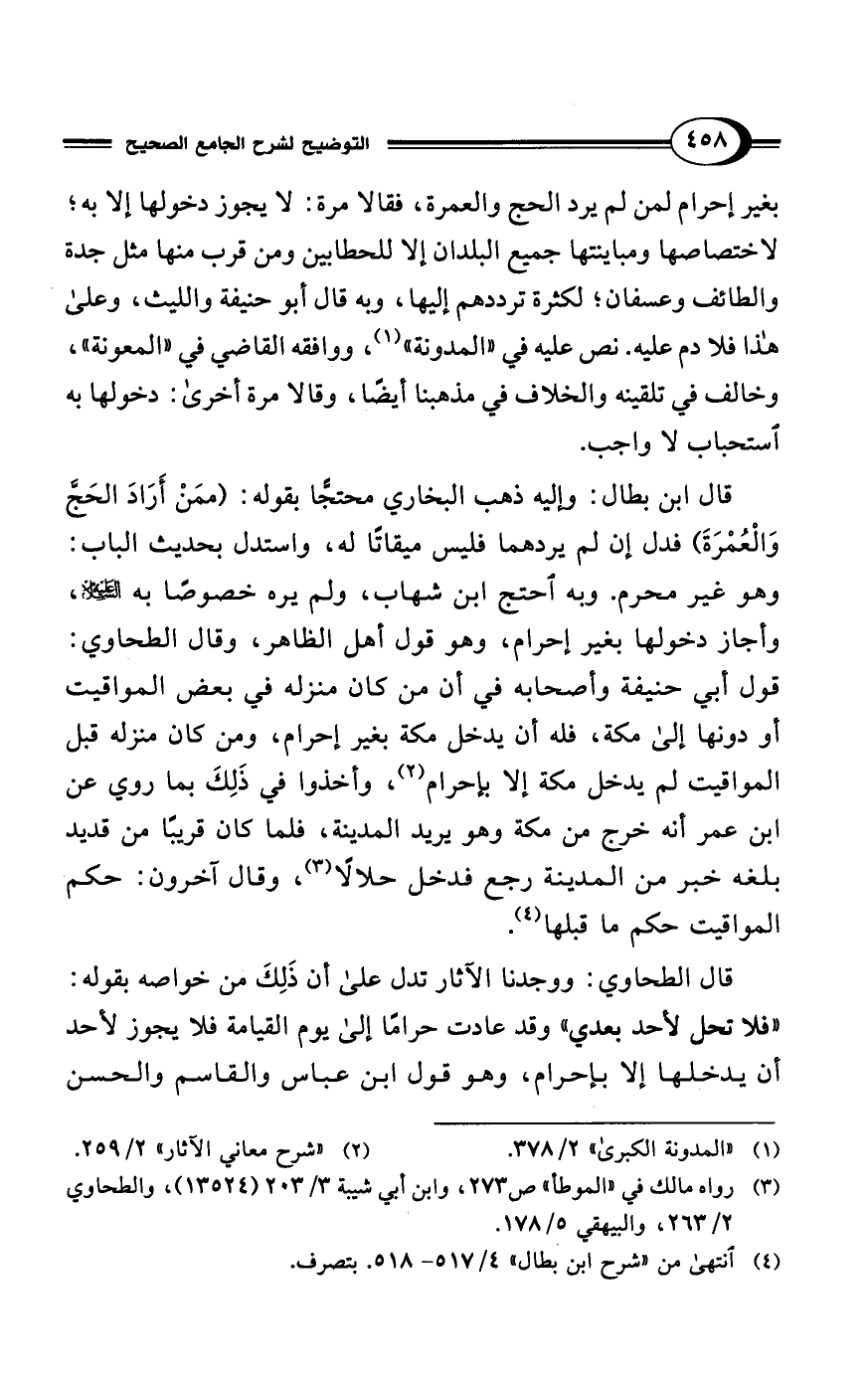 بغير إحرام لمن لم يرد الحج والعمرة، فقالا مرة: لا يجوز دخولها إلا به؛ لاختصاصها ومباينتها جميع البلدان إلا للحطابين ومن قرب منها مثل جدة والطائف وعسفان؛ لكثرة ترددهم إليها، وبه قال أبو حنيفة والليث، وعلى هذا فلا دم عليه. نص عليه في "المدونة" (¬1)، ووافقه القاضي في "المعونة"، وخالف في تلقينه والخلاف في مذهبنا أيضًا، وقالا مرة أخرى: دخولها به استحباب لا واجب.