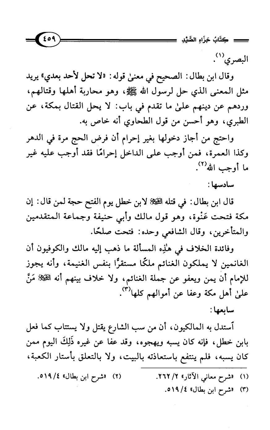 قال ابن بطال: في قتله - عليه السلام - لابن خطل يوم الفتح حجة لمن قال: إن مكة فتحت عَنْوة، وهو قول مالك وأبي حنيفة وجماعة المتقدمين والمتأخرين، وقال الشافعي وحده: فتحت صلحًا.
